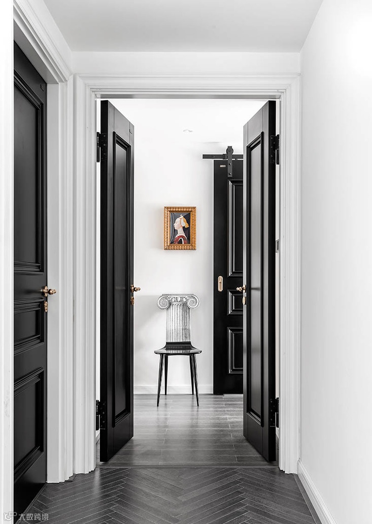 ▲ 加高全房室内门,无限拉伸层高。白色门框+黑色门再配上黄铜把手,满满的高级质感。