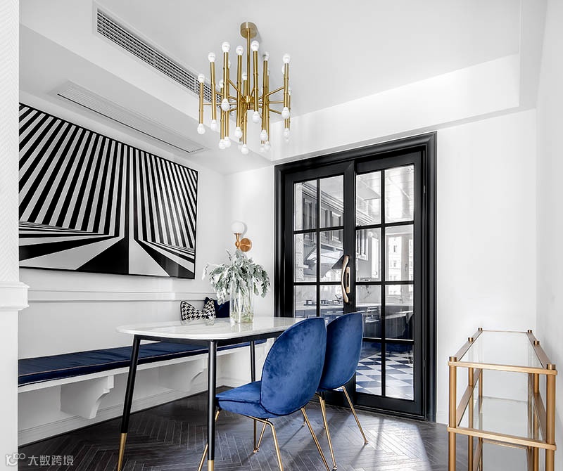 ▲ 挑空设计的卡座配上细腿餐桌椅,让餐厅空间宽敞开阔。厨房黑框玻璃移门增加了餐厅的采光,考虑到空间动线,没有摆放传统的餐边柜,一个金色的置物架足以满足需求。