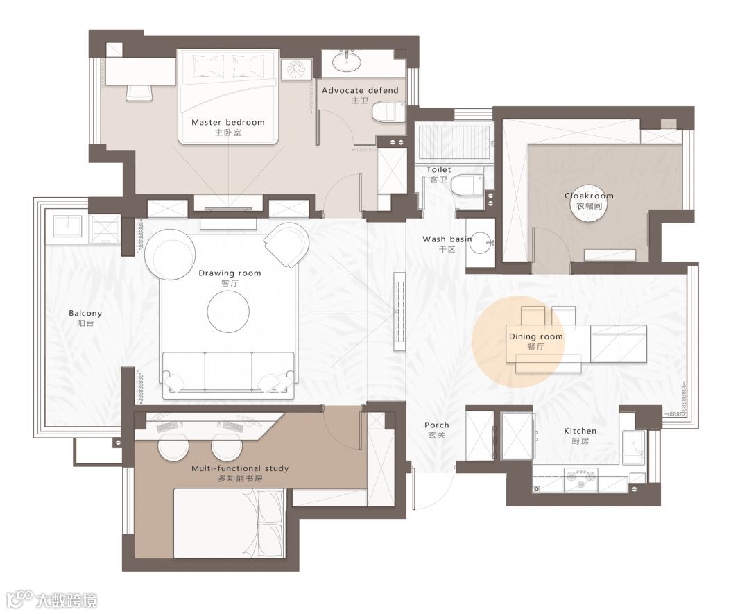 ▲ 电视墙角落摆了一盆千年木盆栽,与空间暖色调保持一致。金属架的圆形大理石茶几,也让空间显得更加优雅细腻。