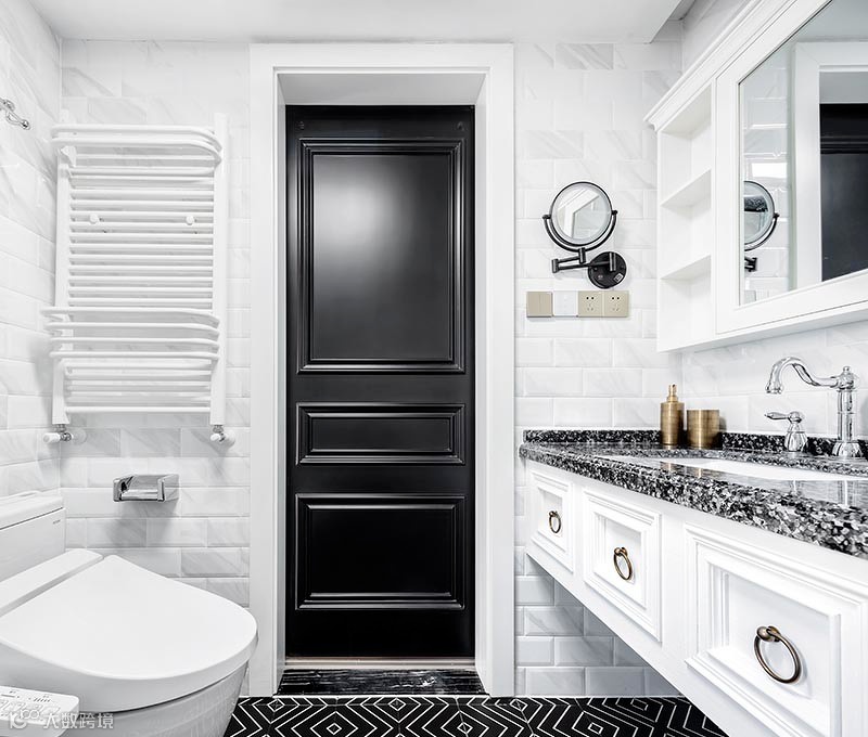 ▲ 次卫墙面的细腻纹理非常有质感,搭配高级恒久的黑、画龙点睛的黄铜把手,让复古和现代融为一体。