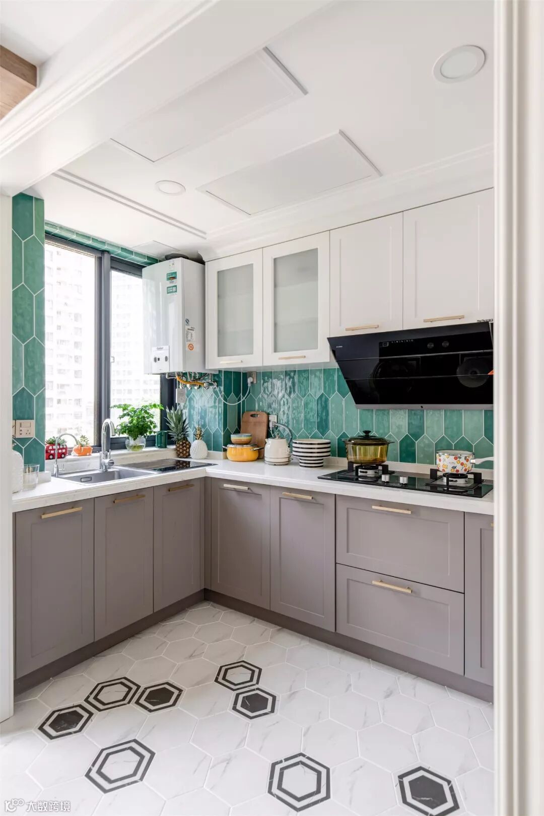 清新绿色的墙面砖与六边形拼花地砖,让整个厨房空间在整洁中散发着灵动的气息,窗台摆放的绿植也给整个空间带来了生机。