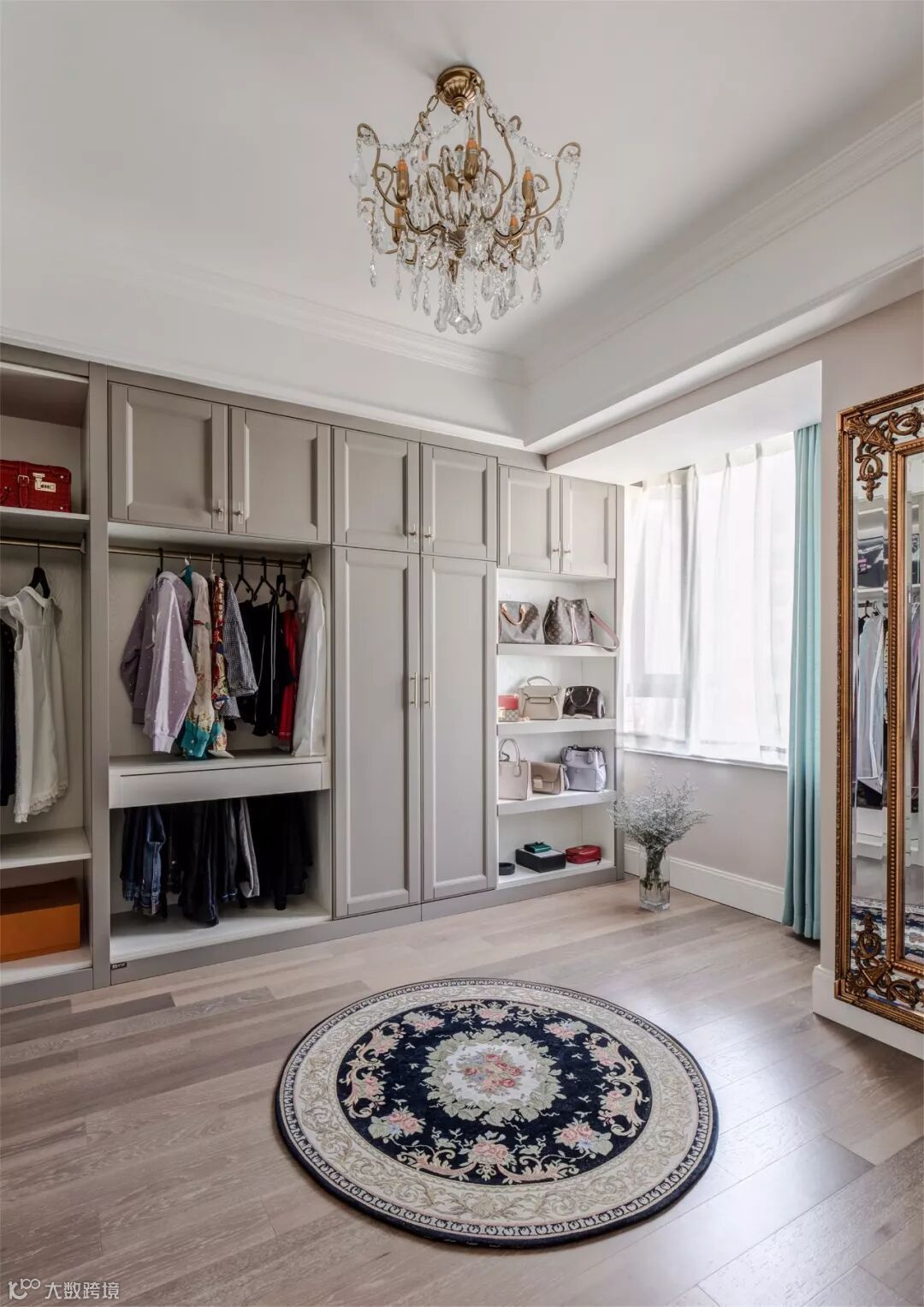 北卧是一个完整的衣帽间,有条不紊的放着所需物品,碎花圆地毯,整个空间散发着复古气息。