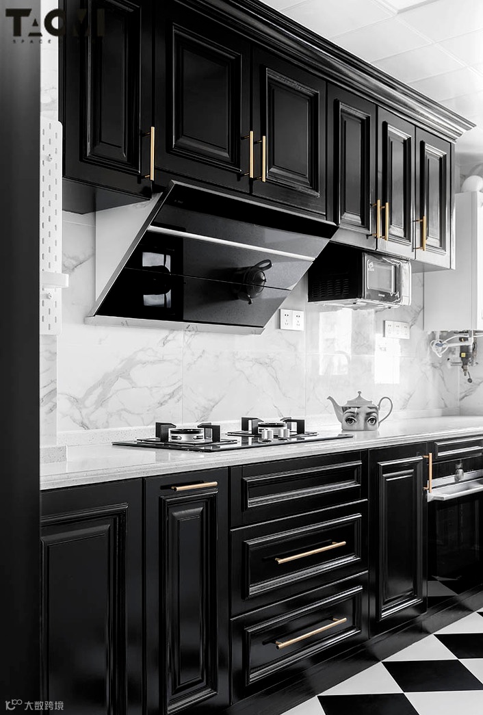 ▲ 厨房,黑白棋盘格地砖、黑色橱柜,连烟灶机、烤箱、微波炉等电器也全部选择黑色,格外有质感。