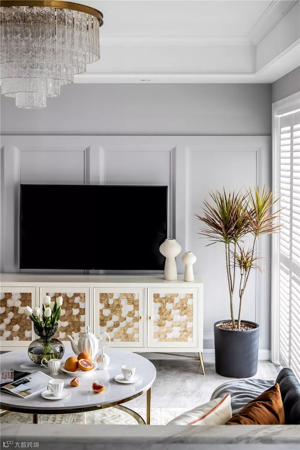 ▲ 电视柜前身采用贝壳纹装饰,气质灵动而华丽。造型别致的陶瓷花瓶与清新花束,都给整个客厅的装修设计增添了一抹亮色。