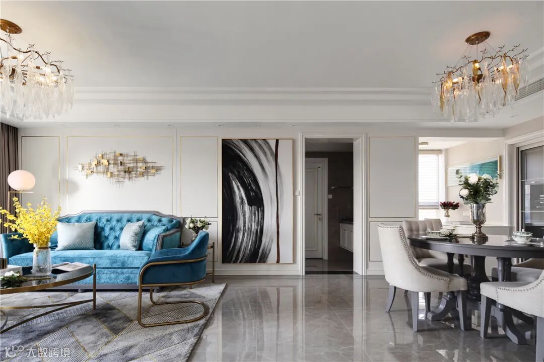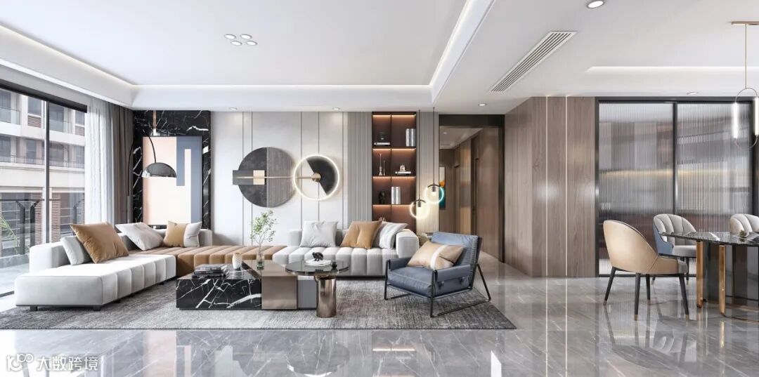 轻奢风常用材质:护墙板、墙咔、镜面、大理石、皮/丝绒沙发。