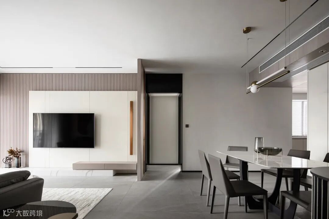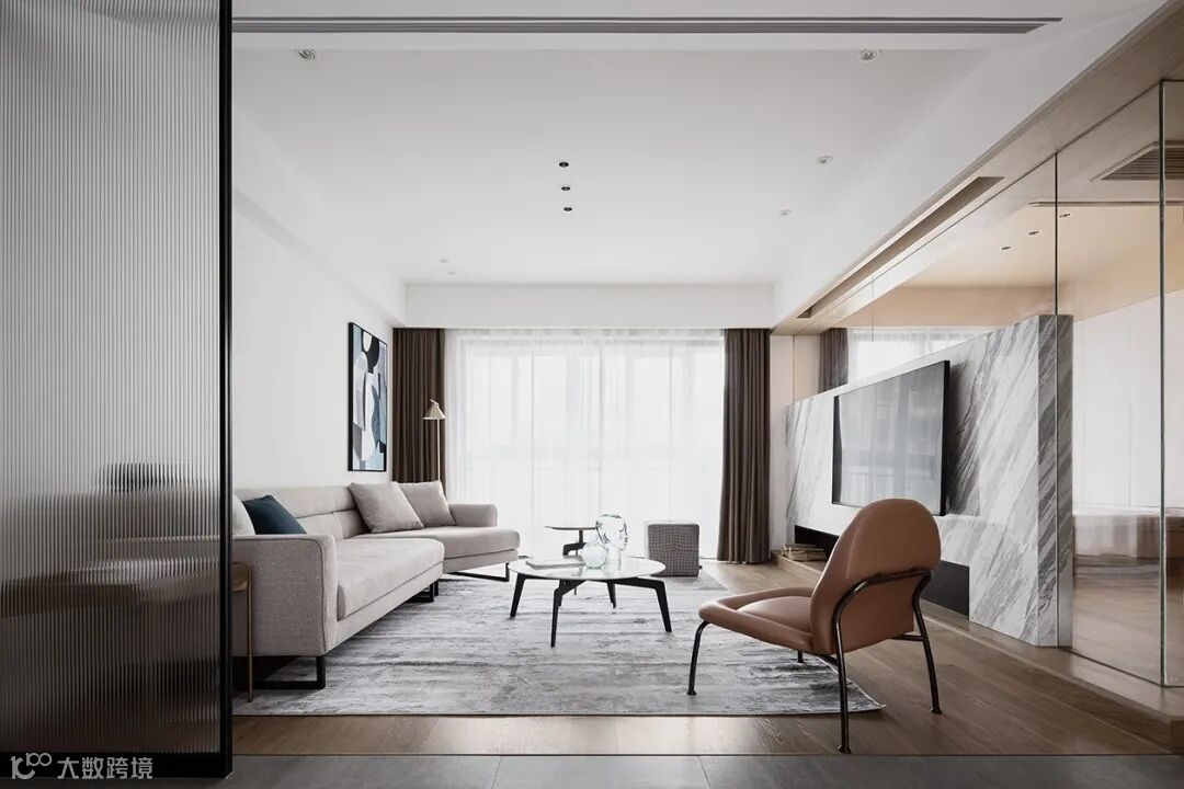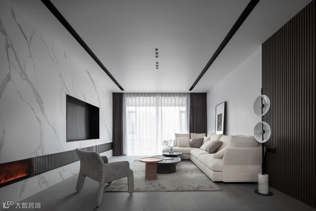 ②善用线条材质,比如木饰面、大理石、灯具等,提高空间层次感。