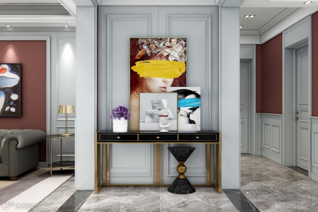 进门对着墙,可以选择留出过道,保证其他空间采光通风,在墙前面可选择做斗柜或者半高柜子,既可以满足储物需求还可以在台面摆放饰品,减少视觉压迫感。