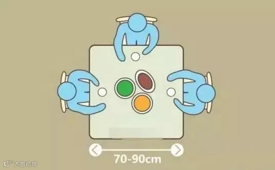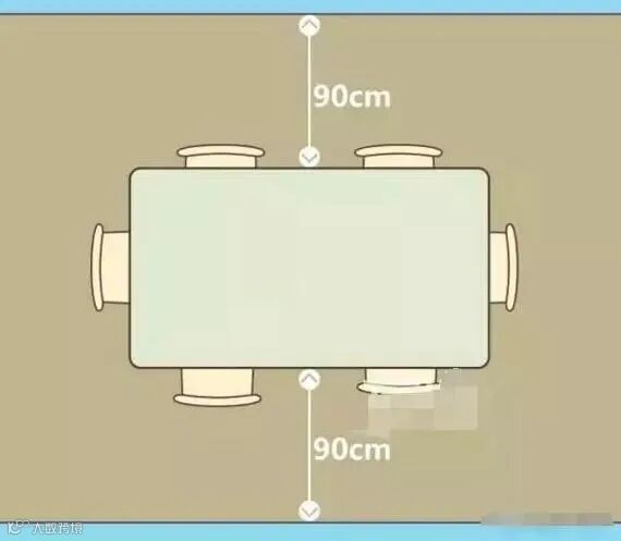 餐桌周围的空间不能太拥挤,不然落座、起身都会受影响。一般建议留出90cm的距离。