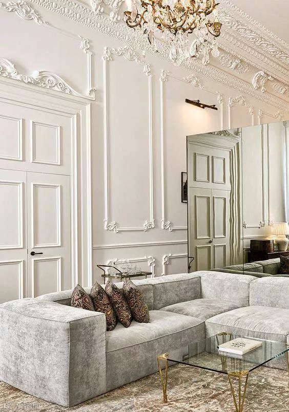 大白墙+石膏线的组合,让空间充满立体的线条感,增添了一抹复古优雅的气质。