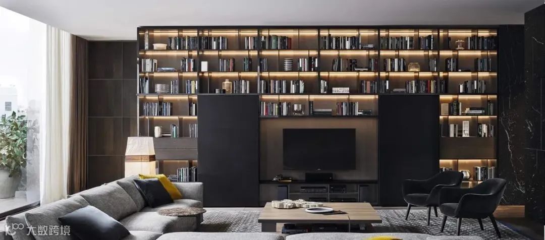 客厅墙面亦是储物展示柜,可根据收纳需求进行定制,如通顶收纳柜、储物格子、矮柜、多个小柜组合、搁板、壁龛等。