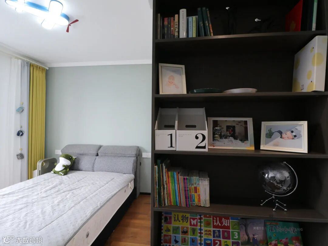 ▲ 次卧,浅绿色纹路的背景墙搭配飞机形状主灯,床上的鲨鱼玩偶增添趣味