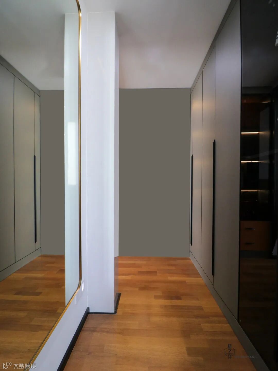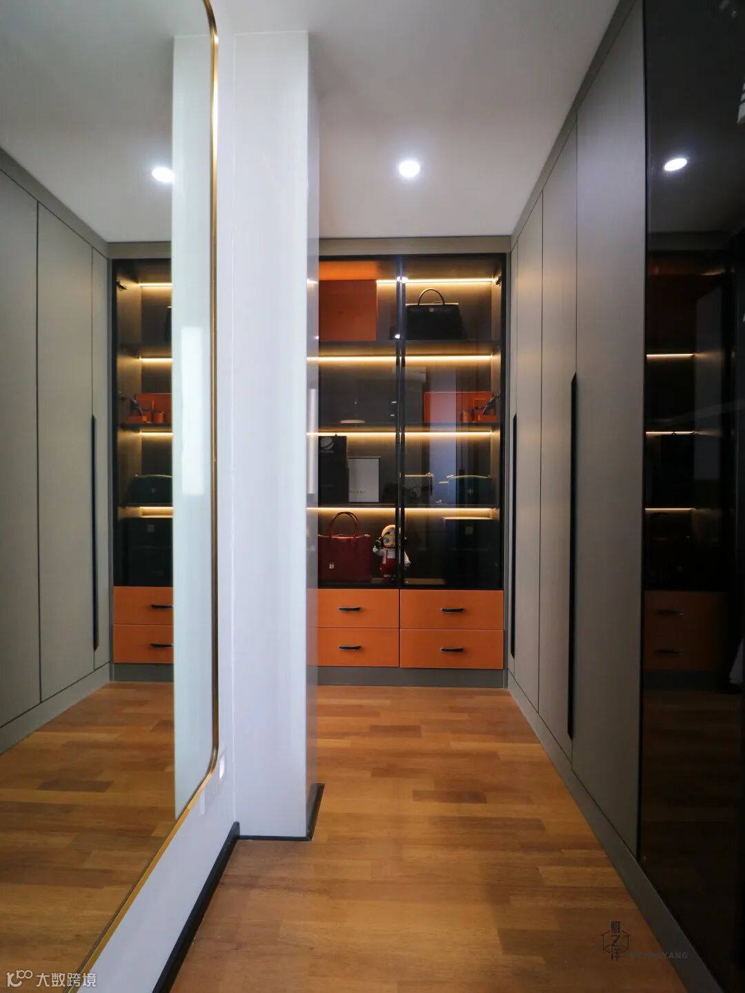 ▲ 改造后,木饰纹的地板散发低调奢华,还在角落布置了置包柜,布置的造型吊灯与落地镜,现代感十足