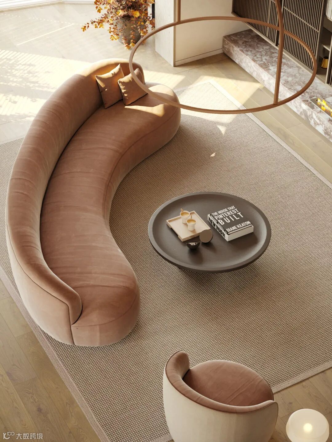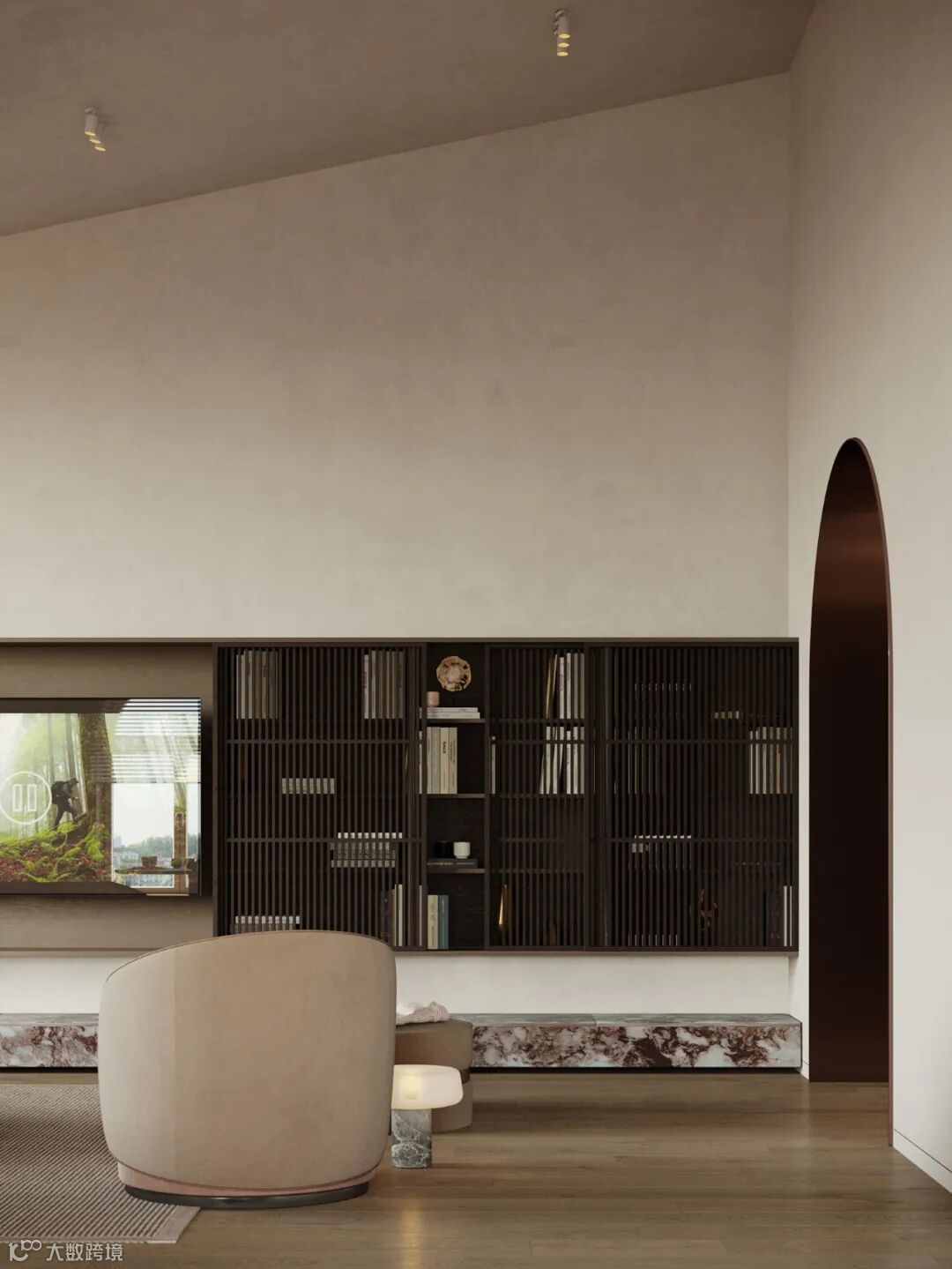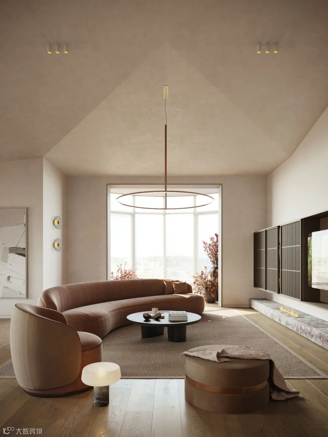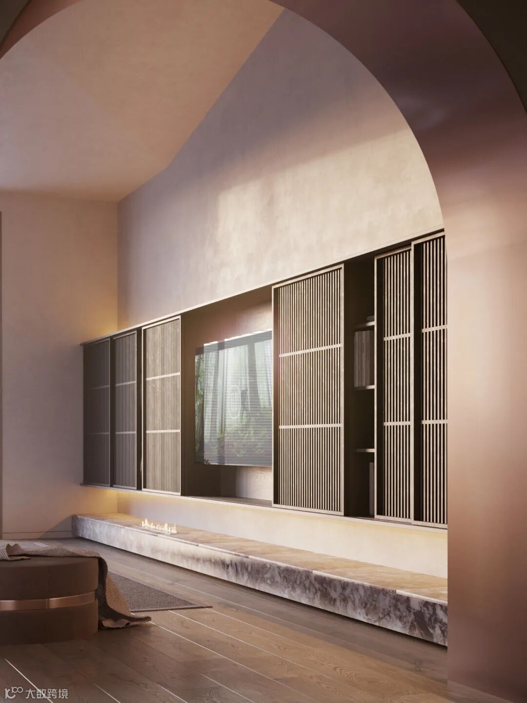 通过金属拱门,便进入客厅空间,客厅电视墙一改传统的设计将细腻的木质肌理嵌入墙体,栅格推拉门增添了一些起伏感,与大理石搭配,温情而优雅,嵌入弧形沙发,圆形吊灯,曲线蔓延,柔和了整个空间。