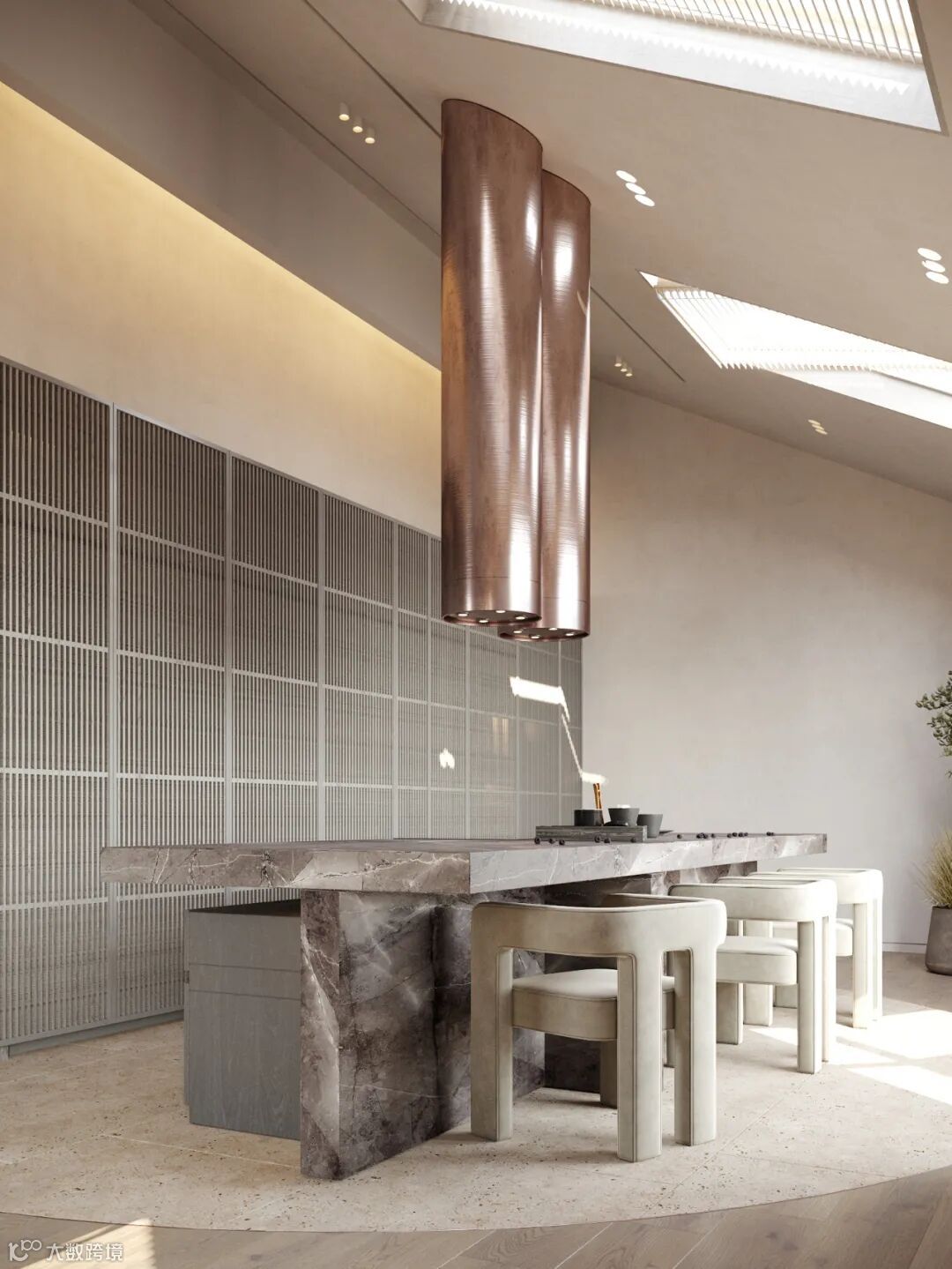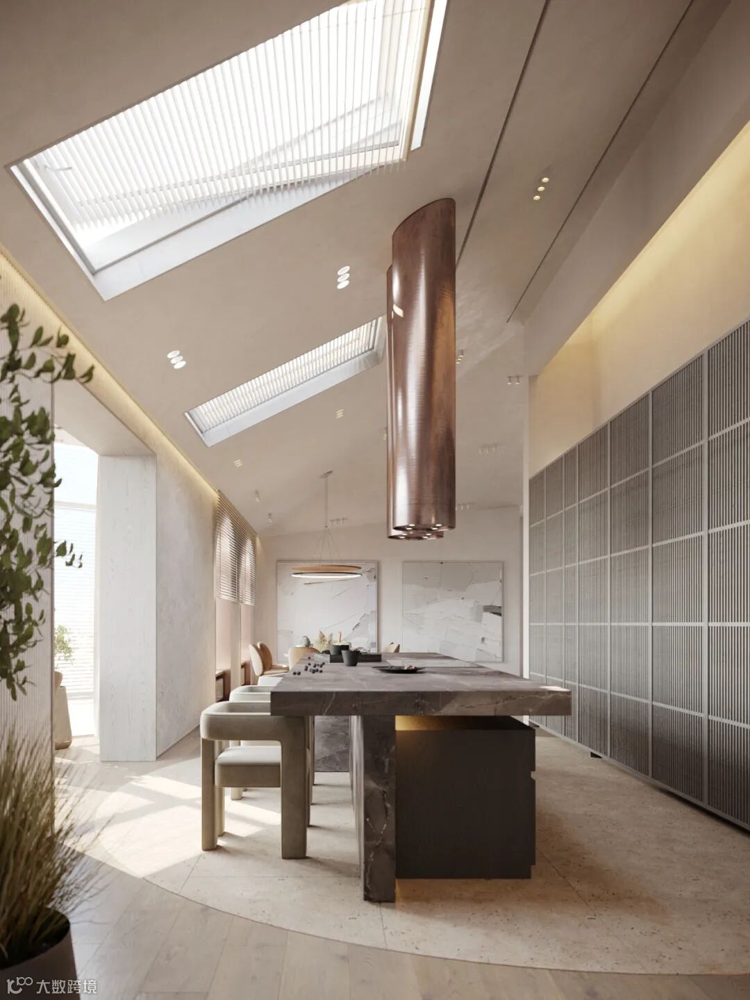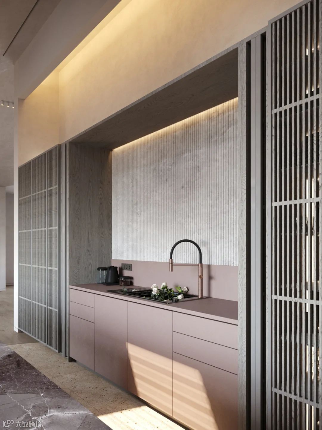 步入厨房,灰色的包裹下,斜屋顶、金属和石材的搭配,引爆了一场侘寂与轻奢之美的视觉盛宴,橱柜采用隐形式推拉门,栅格与肤感板,形成秩序感的层次划分,自然光线下呈现静谧的氛围。