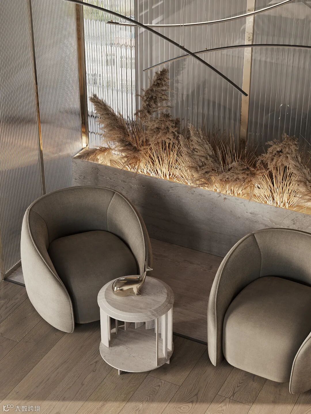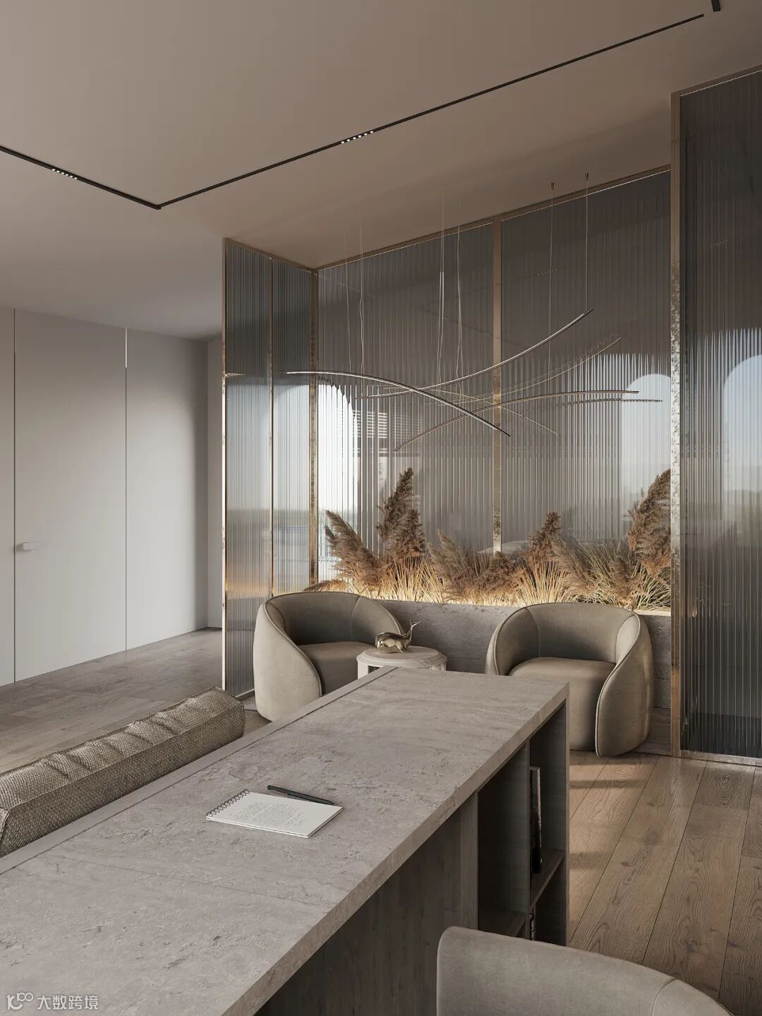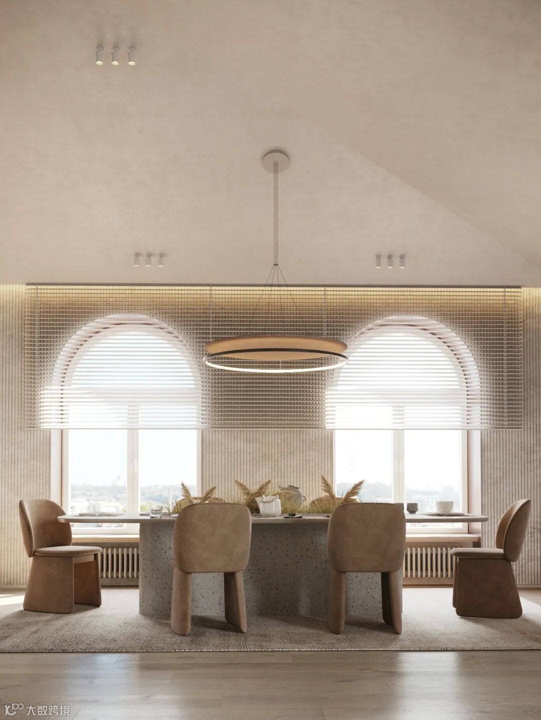 清暖感是侘寂空间回馈给生活的艺术和理智,在餐厅,这种感知被推至了更高的情绪点,水磨石与木组成的餐桌,搭配绒布餐椅,使得现代艺术和自然纯朴的质感相融合。