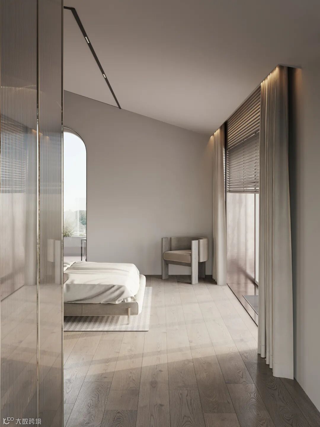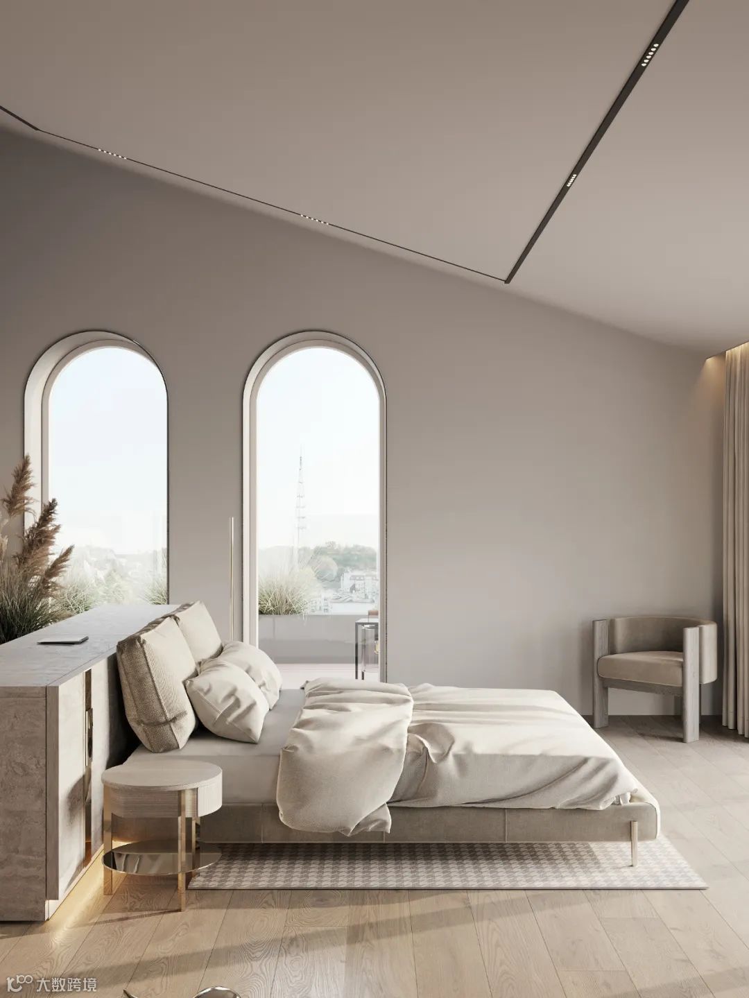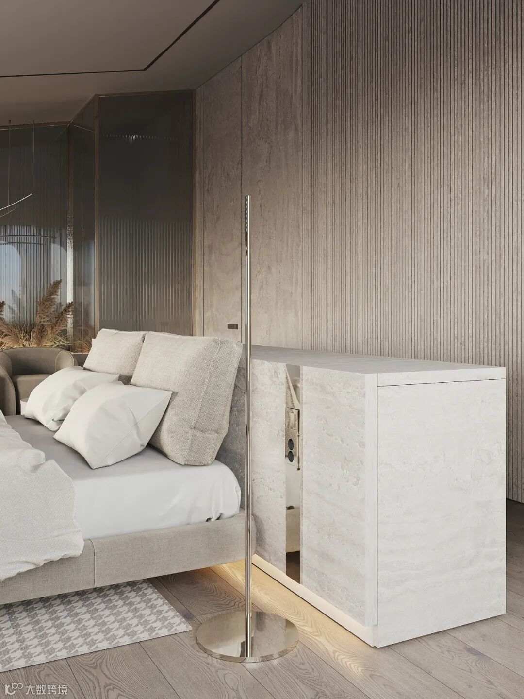 浅灰色的基调在空间中晕染开来,在阳光的投射下,营造出质朴舒适的卧室空间,将石材、长虹玻璃依空间所定制背景墙及护墙,完美融于环境之中,搭配灰色系的床品,将侘寂风的质感体现的淋漓尽致。