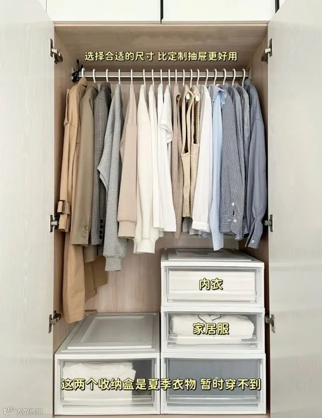 通常衣柜都是60公分的深度,再分出一定高度的小格,衣服放一摞,浪费空间,放两摞,里边的又看不见,总之就是不方便。