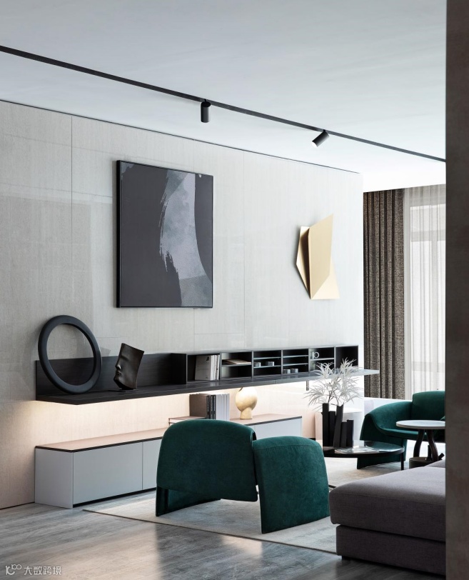 软装元素的摆放讲求构图的完整性,不仅要与大环境融洽,还要有主次分明的层次感。一般以三角形为标准,从正面观看时,饰品元素整体大致呈现三角形形状,能够符合人们的视觉习惯,在此基础上可以控制调整间距、位置等,使其达到空间中的平衡。