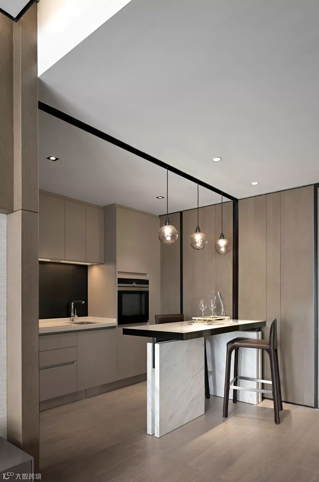 客餐厅采用了无形分隔的处理手法,通过线条与体块的交织构成,勾勒出空间的立体层次,摒弃冗杂的装饰,极尽克制内敛的品格。