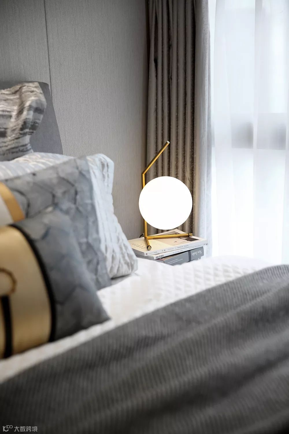 高级灰占据的卧室,弱化无足轻重的饰品,卧榻的地位被凸显无疑。墙面大幅绘画,选用弗洛伊德式的“梦”主题,如同一扇门打开远方。