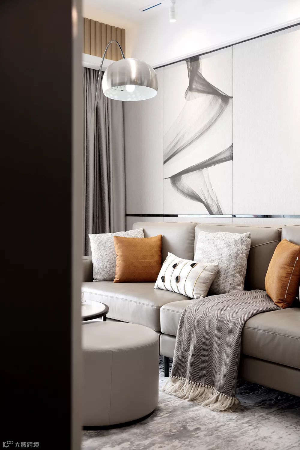 空间游离在黑白灰之间,并采用棕黄色作为跳跃色,舒适的沙发、灰色条纹地毯、时尚的抱枕和经典的钓鱼灯,营造出丰富多元的空间情感。色泽交替与造型转换,都在不经意间彰显着主人的个性与品位。