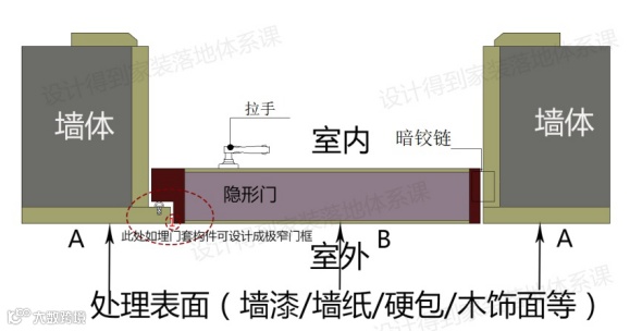 下面我们通过一些实际案例来分析(上图中A代表墙面材质,B代表门的外观材质)根据上面结构图,我们分两个方向来介绍常见的平开式隐形门。