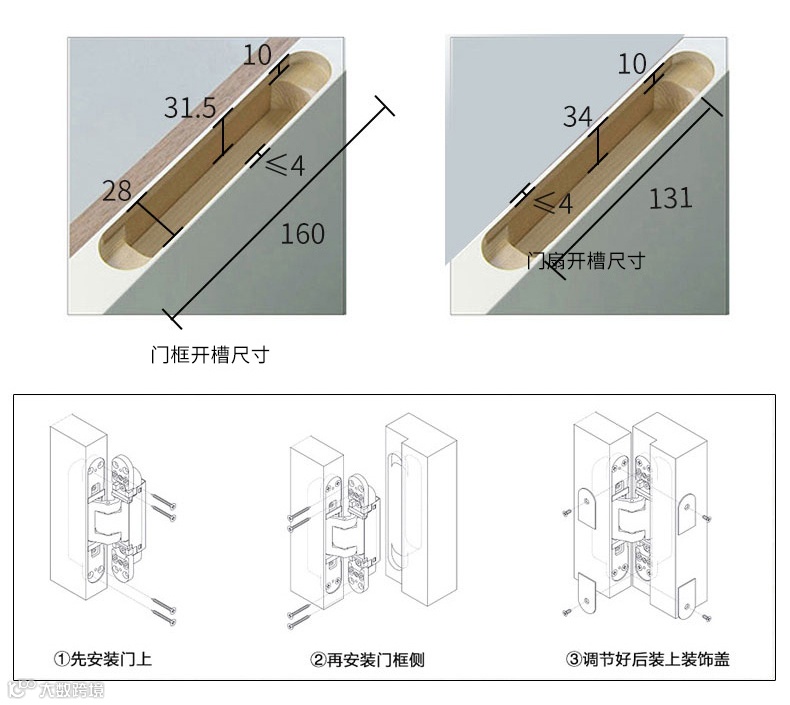 暗铰链:根据门的不同厚度选择暗铰的大小,优点是门前门后都能起到隐藏效果,需要门板和门框开槽,但普通暗铰起不到液压缓冲效果,需要在门后加装闭门器。