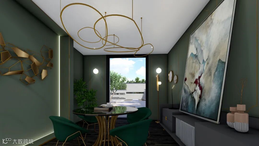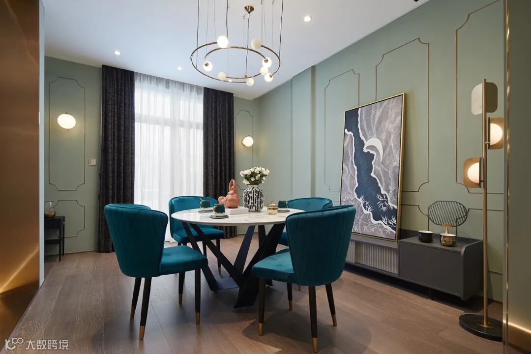 孔雀蓝配色,无可比拟的华美轻奢,演绎清雅家居格调,在高级灰的空间中,注入亮丽的孔雀蓝色与清浅的海蓝色,内敛沉静的暗色与色泽明艳的亮色色调对比,如同拨开云雾之后的瀚海与苍穹。