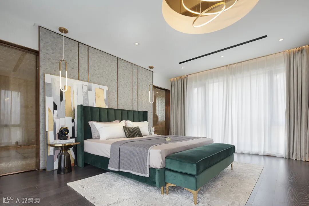 当深青色作为空间的强调色时,卧室中一些重要家具,比如床、床头柜以及床品可以使用深青色,而背景色则可以选择高级灰。