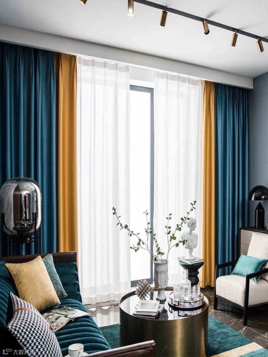 03.根据家装风格选择。现代简约风可以选择黑白灰色调的窗帘;轻奢、美式、欧式选择亮橙色与灰色、蓝色的拼色窗帘......