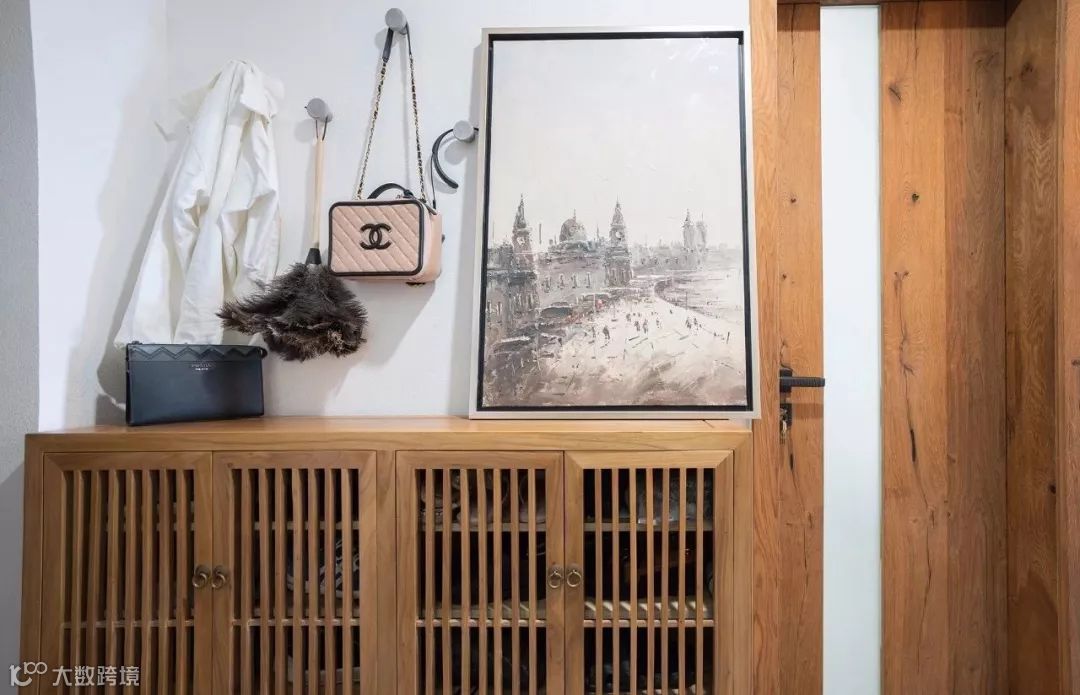 入户玄关走廊的侧方摆放了一个矮鞋柜,格栅门的鞋柜可以避免空间不流通而导致鞋子发臭。鞋柜上方摆放装饰画和挂钩,使用方便又好看。