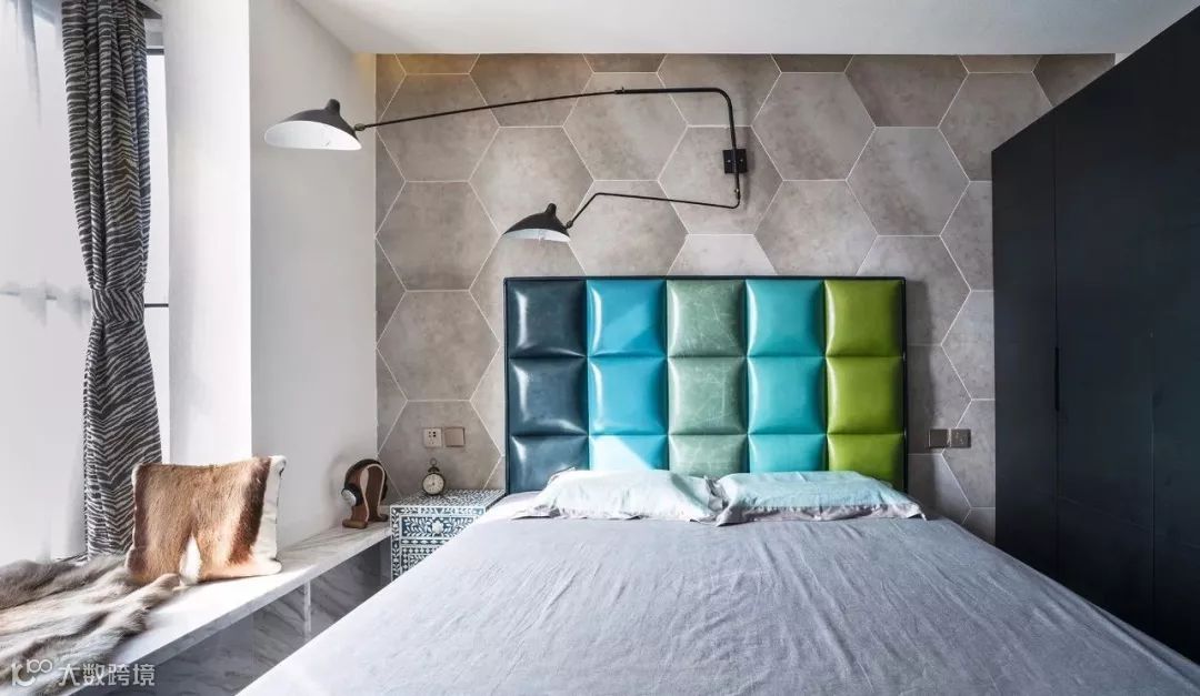 主卧室的床头背景墙铺贴了灰色系的六边砖,搭配一个趣味十足的床头靠背,整个主卧给人一种创意满满的感觉,个性化十足。