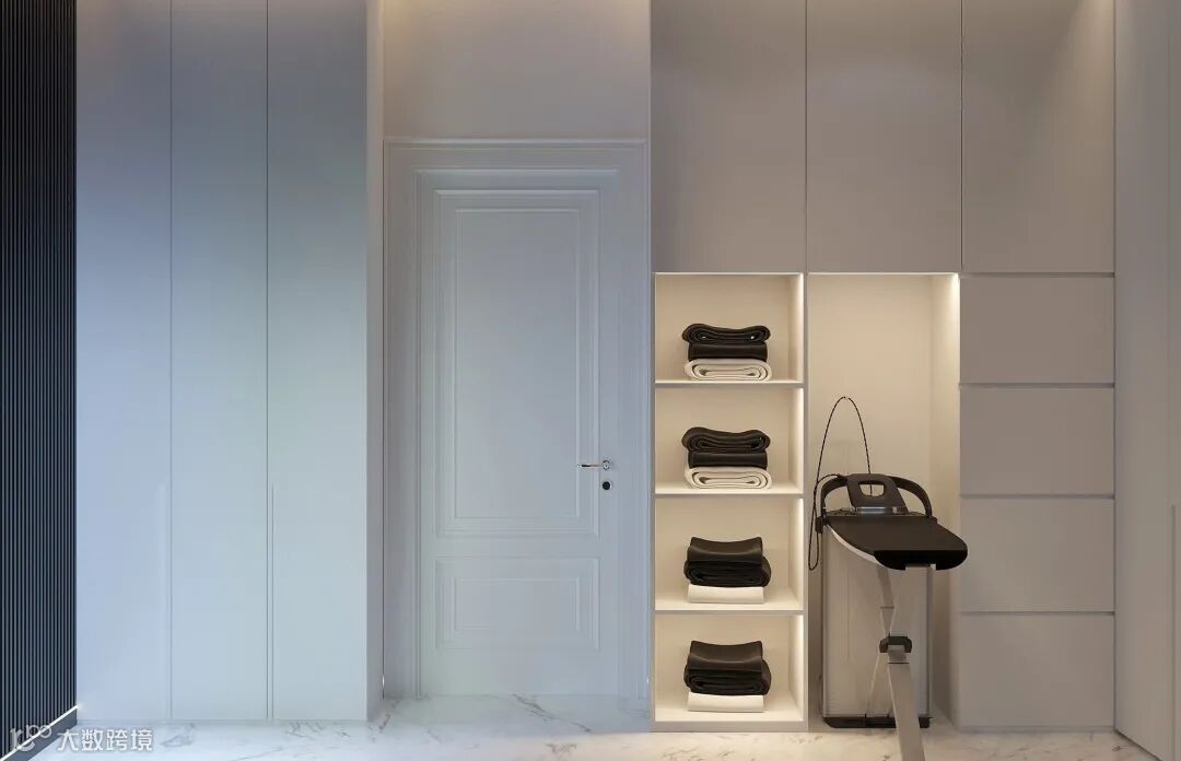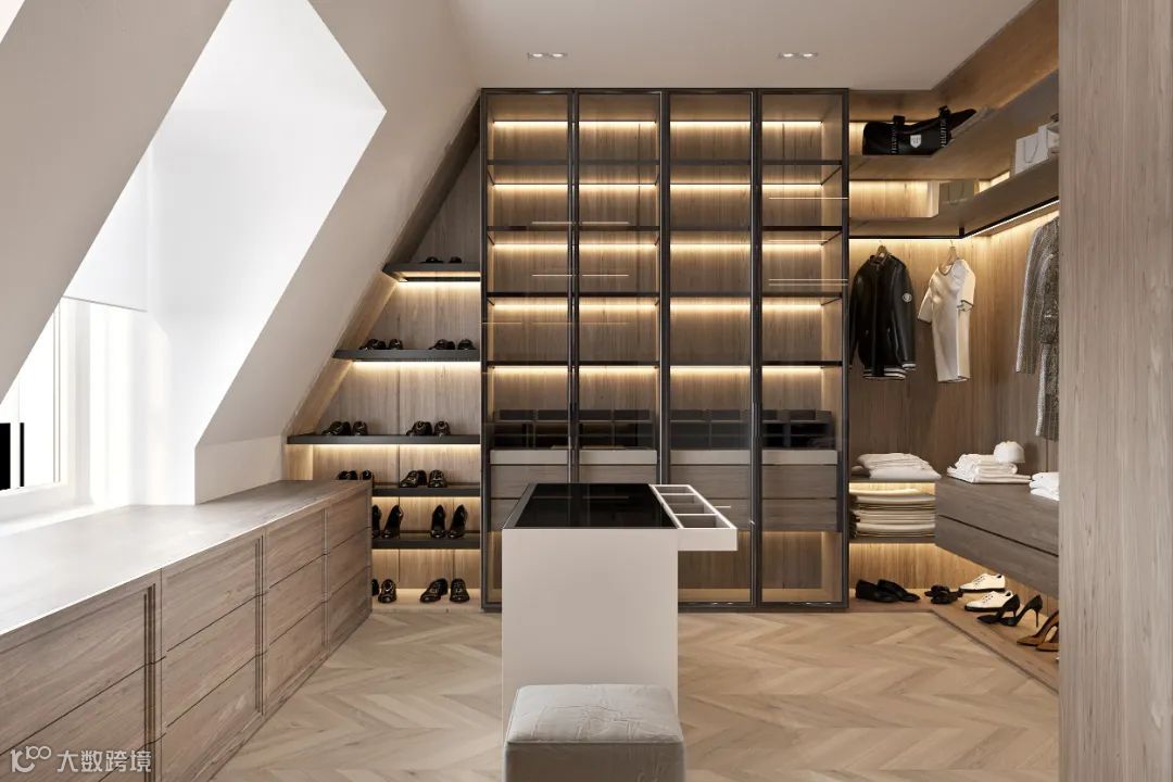 衣帽间部分,设计师对空间进行了有序的划分,令物品得到了有序的摆放。