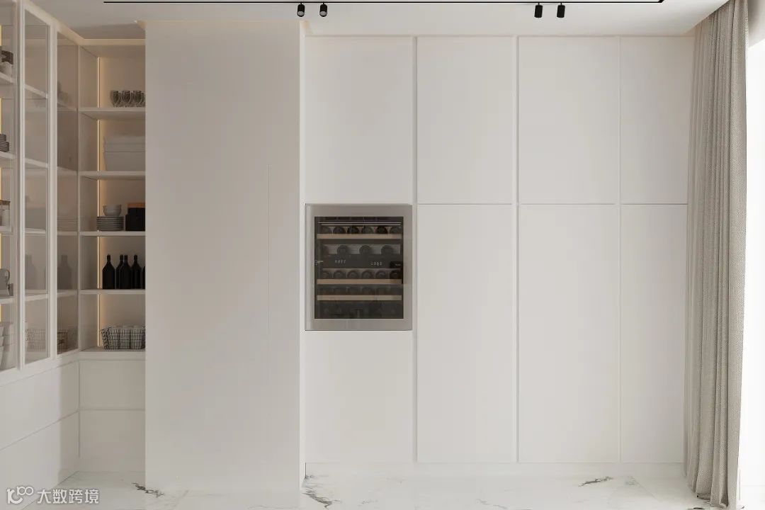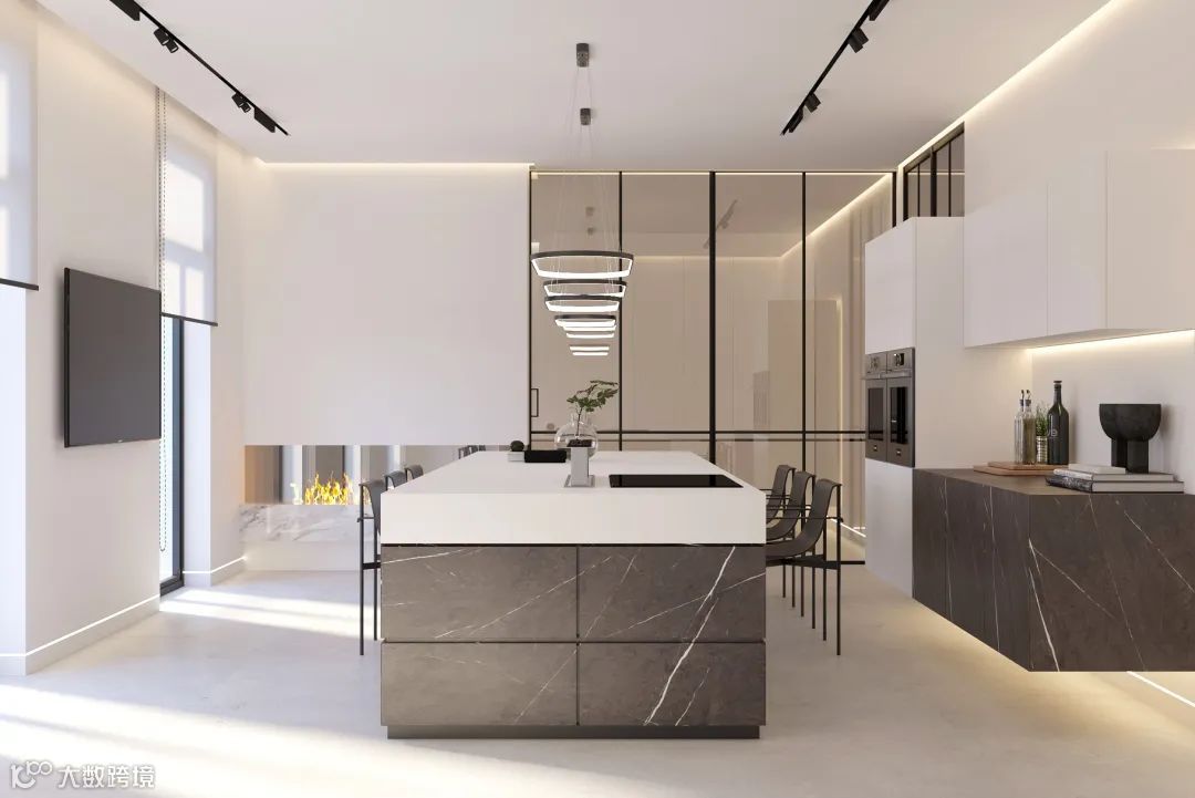 厨房空间中,白色,灰色的配色看起来大气时尚,大理石元素的运用,令空间更具轻奢感。
