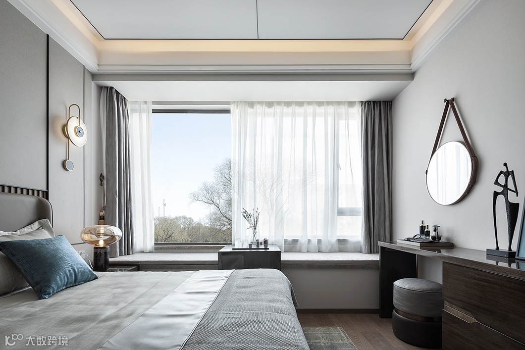 次卧延续了整体的现代设计语汇,温暖而又舒适。严谨与克制,在相互对抗中,以协调的艺术语言挖掘冲突的均衡,平衡空间场域,形成了一番新的秩序美感。