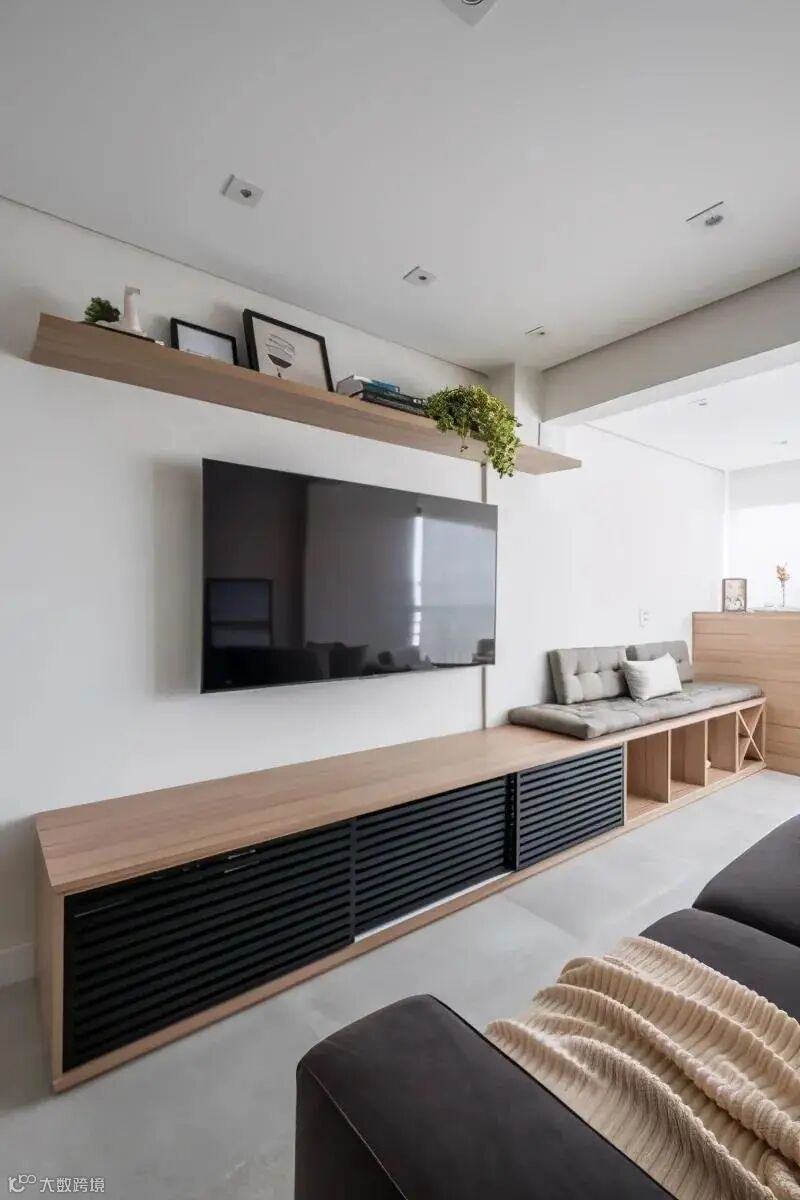 定制整墙式电视柜,是现下比较流行的,也是收纳容量最大的做法。缺少收纳空间的,别忽略了这面墙↓
