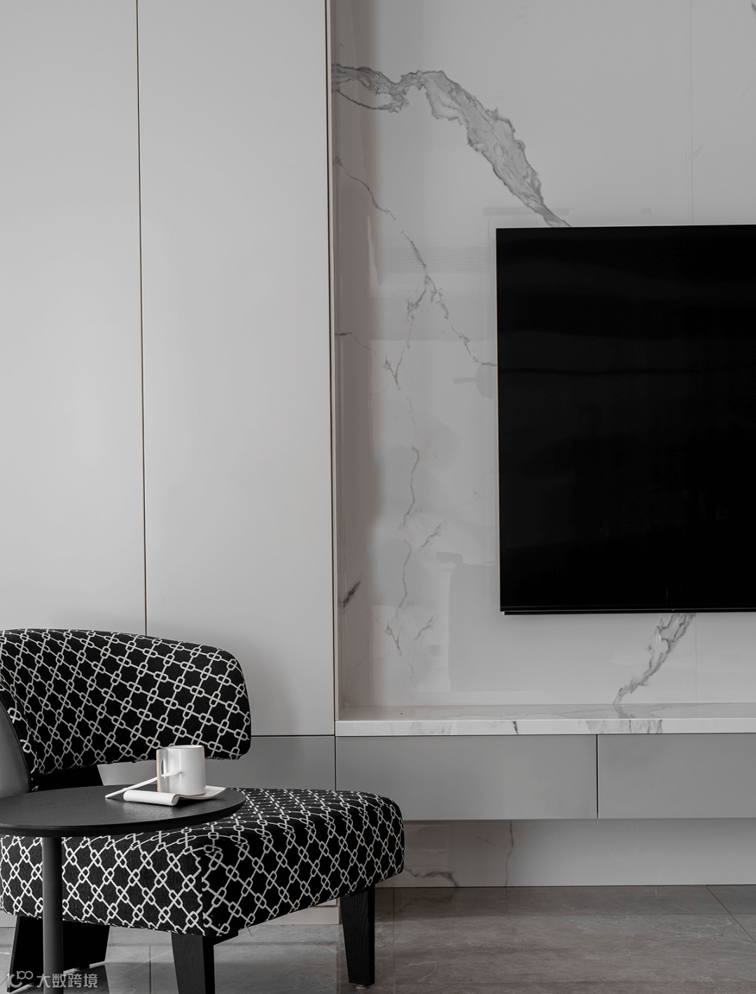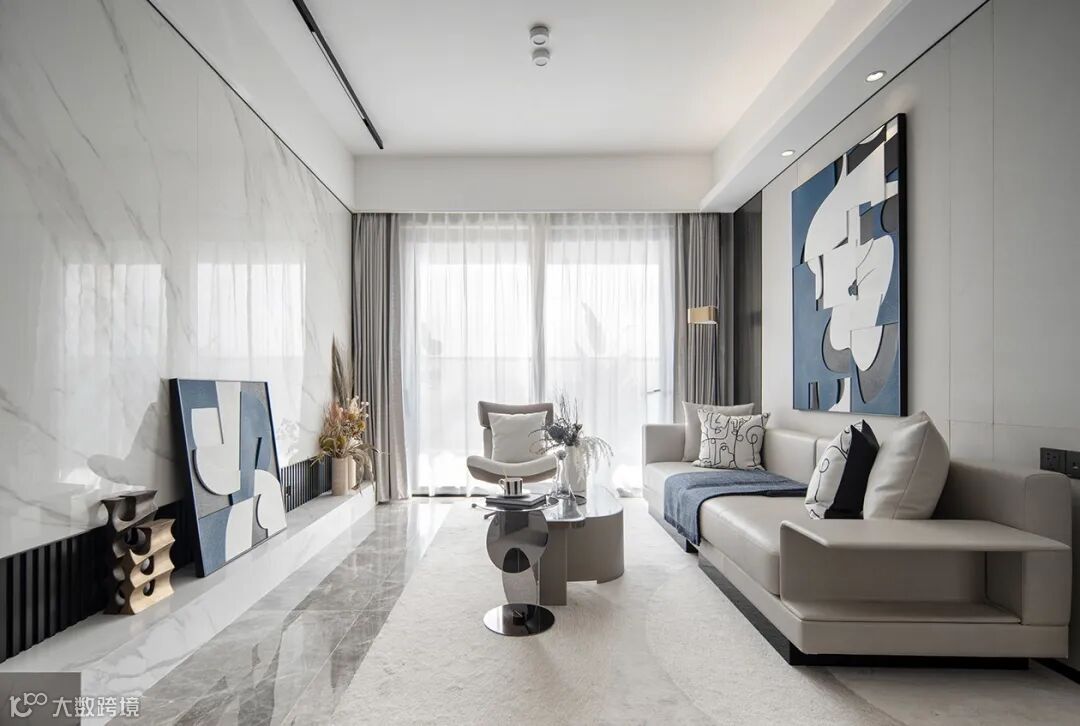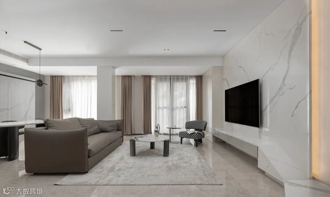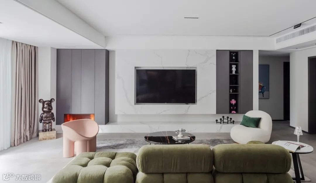 ▶ 悬空设计结合灯带,大理石电视背景墙嵌入电视机,时尚又高级。聚聚子就很喜欢这种,氛围感直接拉满!