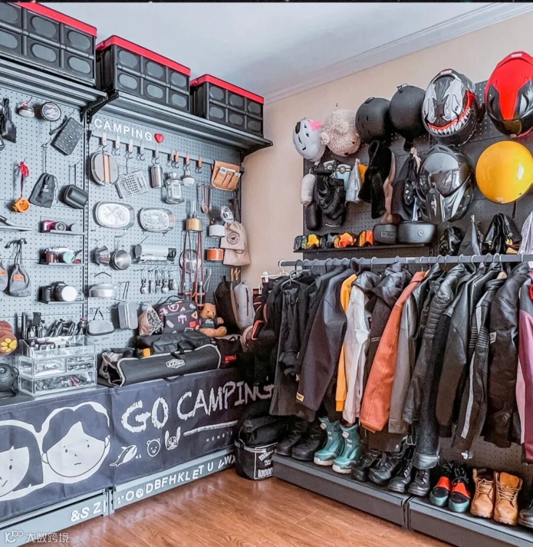 上方搭配收纳袋、收纳箱,摆放外形规整、不太重的大件,减少积灰;中间搭配洞洞板及配件,展示炊具、头盔等小件物品,靠近下方悬挂睡袋等;下方摆放大件重物及不能悬挂的如攀岩鞋等,方便拿取。