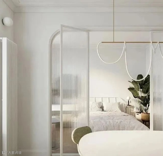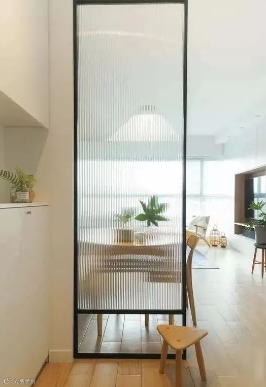 长虹玻璃的特殊质感使它成为了妆点空间的小能手,这种透光不透视的朦胧感作为隔断来划分空间,既不会挡住光线,还能增加美感。▼