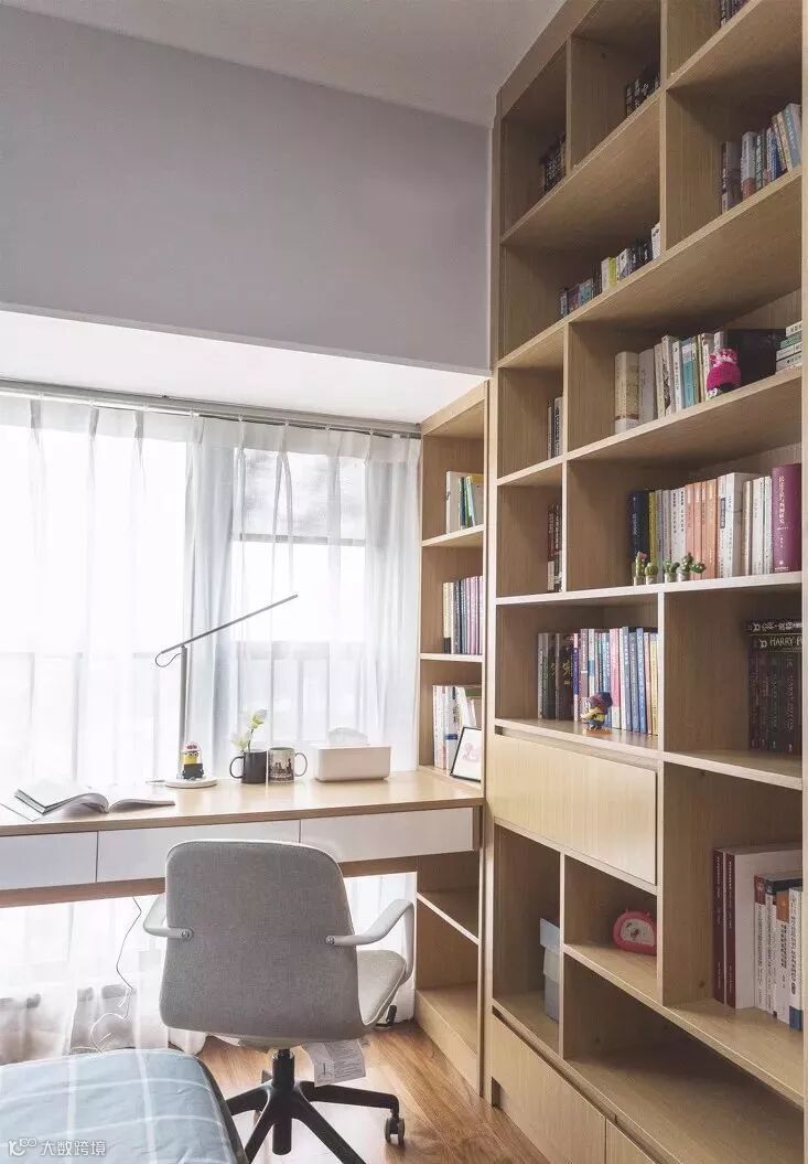 ▲ 利用窗边的角落,一个户型上的凹角,巧妙地把书房设置在这里,开放式的书架和柜子组合起来,底下一张电脑桌就够了。