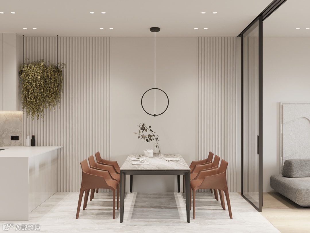 圆形的吊灯,点缀的绿植也增添了餐厅生机。