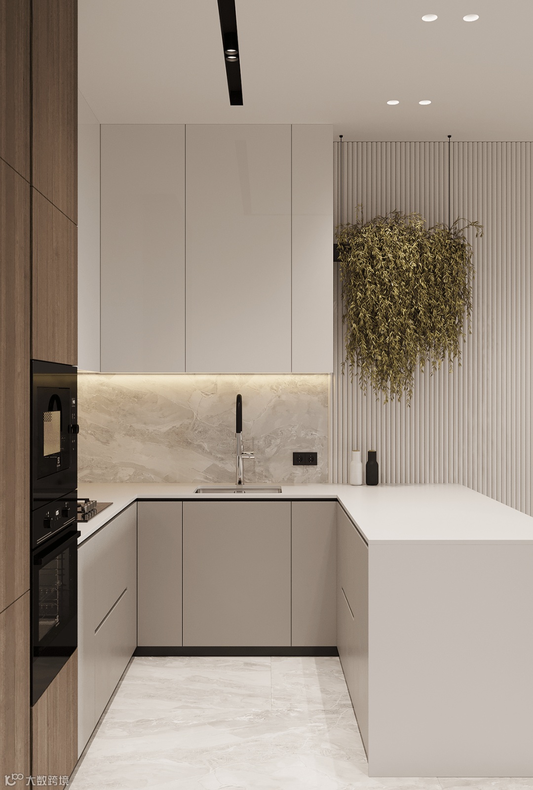 滑动玻璃门把客厅和餐厨区隔开,U字型的橱柜布局既实用又美观,不会造成空间的浪费。