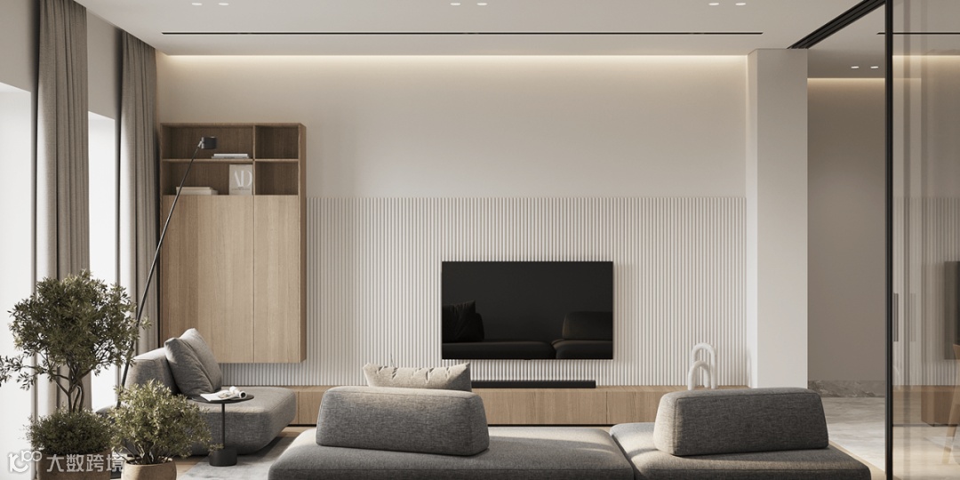 客厅使用浅灰色沙发,灰白色背景墙,绿植的点缀,诠释着整个空间的温柔和静谧,像是洗去一切浮华后最温柔的样子。