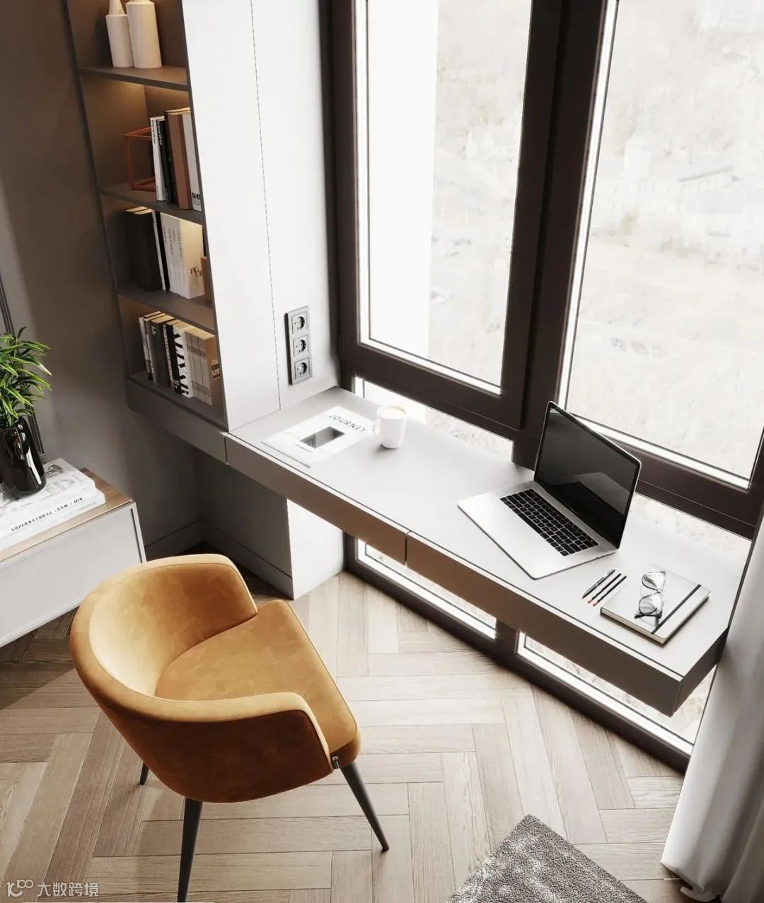 如果窗边风景不错,可以借助窗户布置悬浮式办公桌,这种方法不仅能解锁窗台的多种用途,还能让业主在办公时收获窗外好风光。