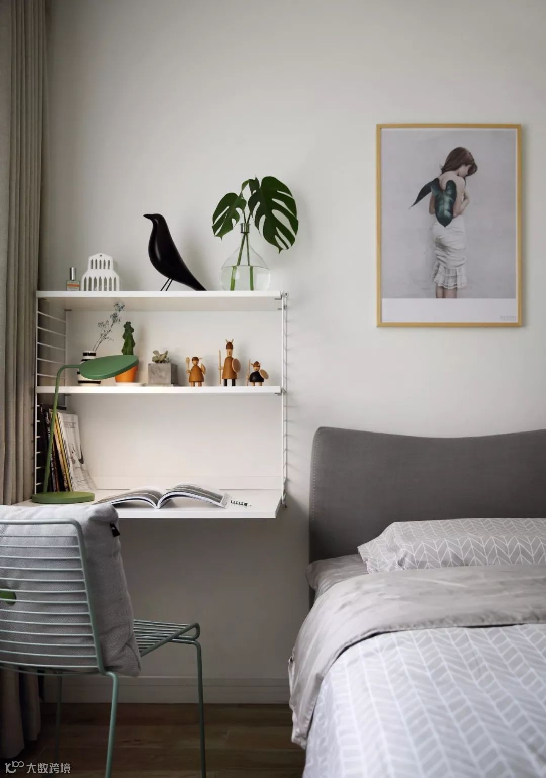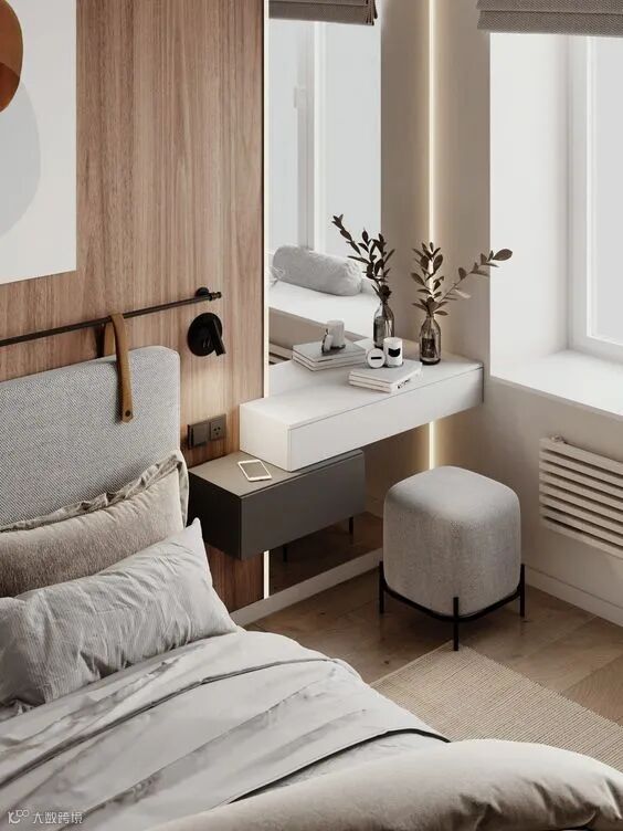 悬浮床头柜与悬浮梳妆台搭配,配合绿植、镜面,再摆上心爱的物件,简单个性的床头功能与美感齐聚。