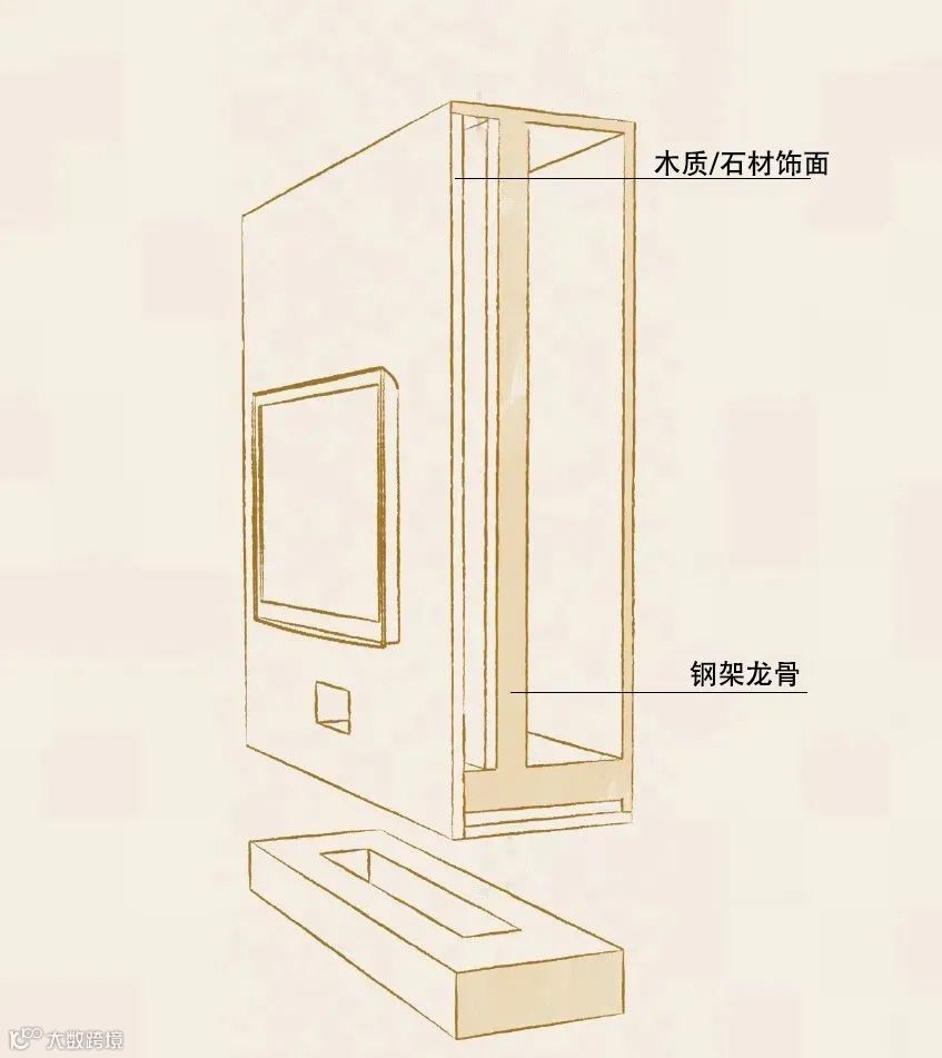 在没有墙体的位置想加悬浮的墙面或者柜体做隔断,可以使用钢架龙骨的方式来打造柜体,根据自己户型的情况,可以将钢架龙骨就近固定在顶面、墙面、地面上,营造悬浮的视觉效果,隔断悬浮电视背景墙一般会用到这个方法。