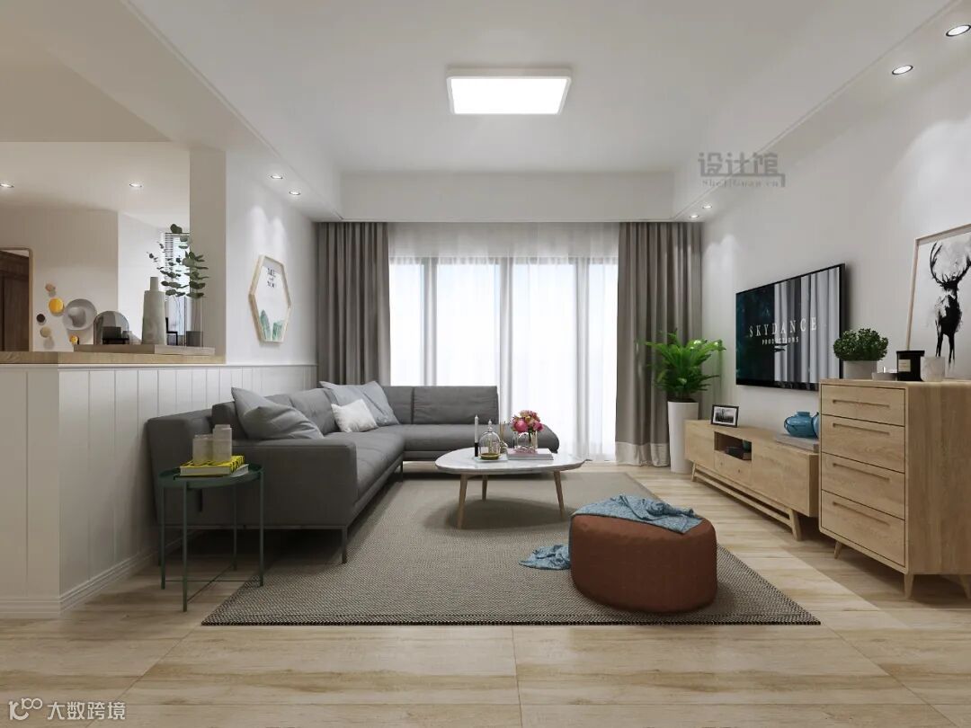 如果只是为了扩大空间感,沙发后面可以做一个矮墙,这样可以安装插座方便沙发区域使用,同时后面也可以适当加入储物,提示空间的实用性。