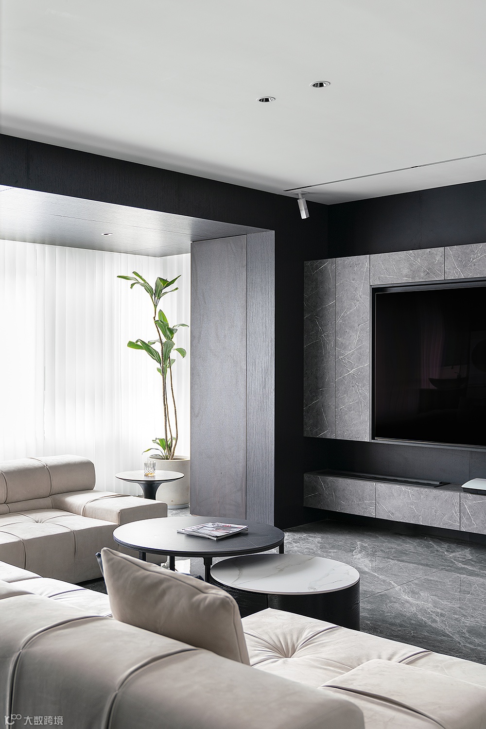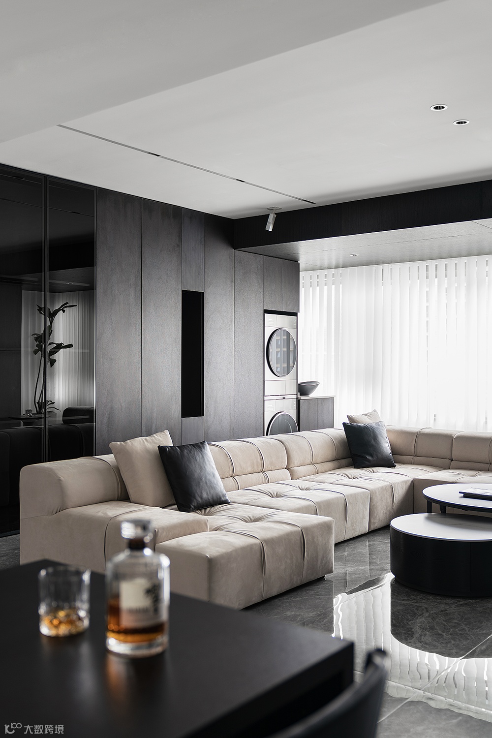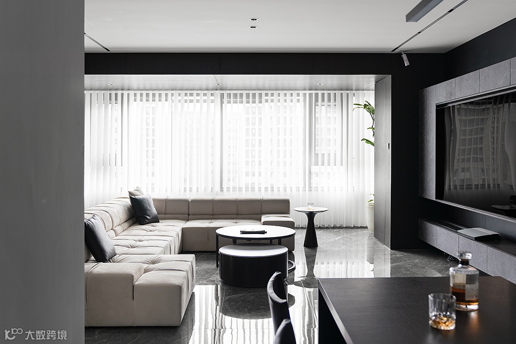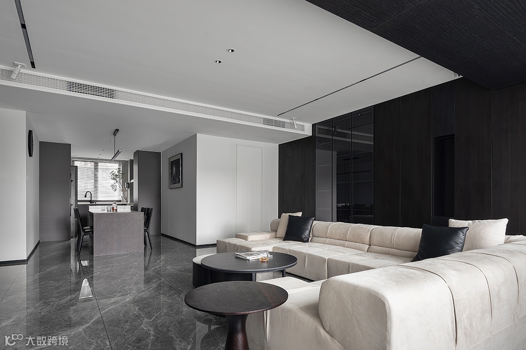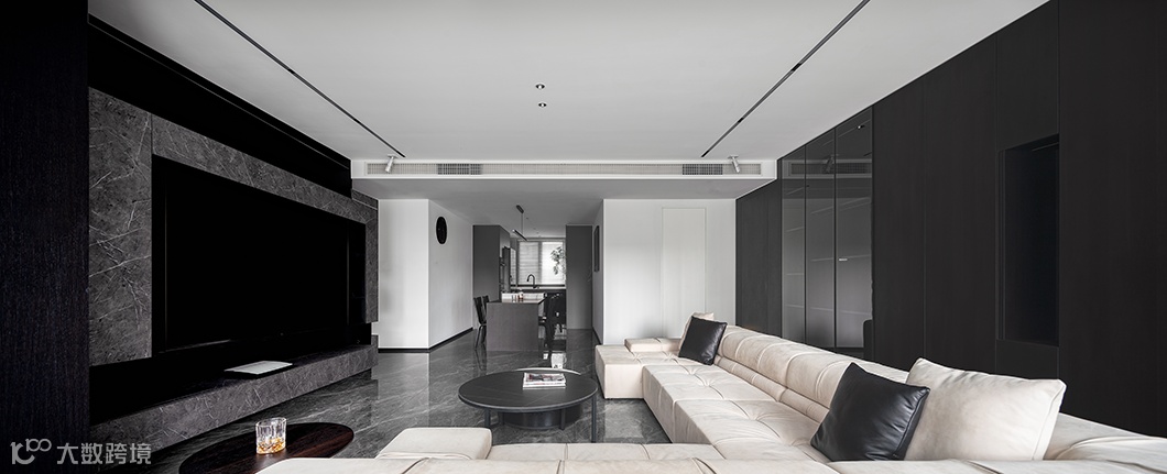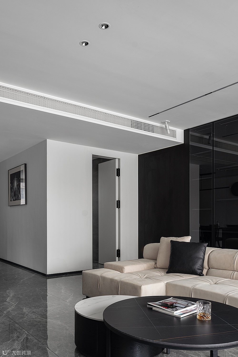 在暗色调的客厅空间里放入富有质感的白色沙发,通过材质的对比调和,交织出简约又大气的秩序美感,空间更显静谧稳重。