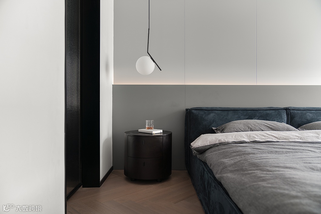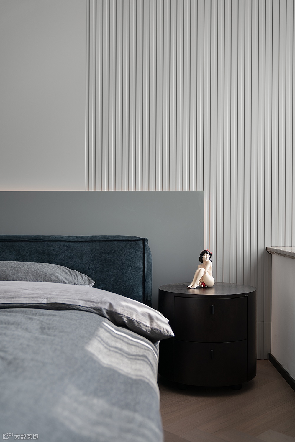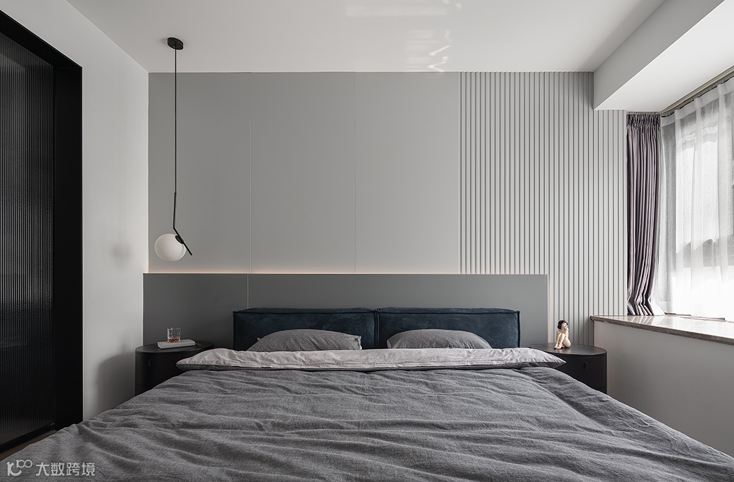 卧室的设计以简约为主,灰色护墙板+格栅板,带来丰富的层次感,同时丰富了空间线条,床头内嵌暖黄色灯带,充分贴合睡眠环境。