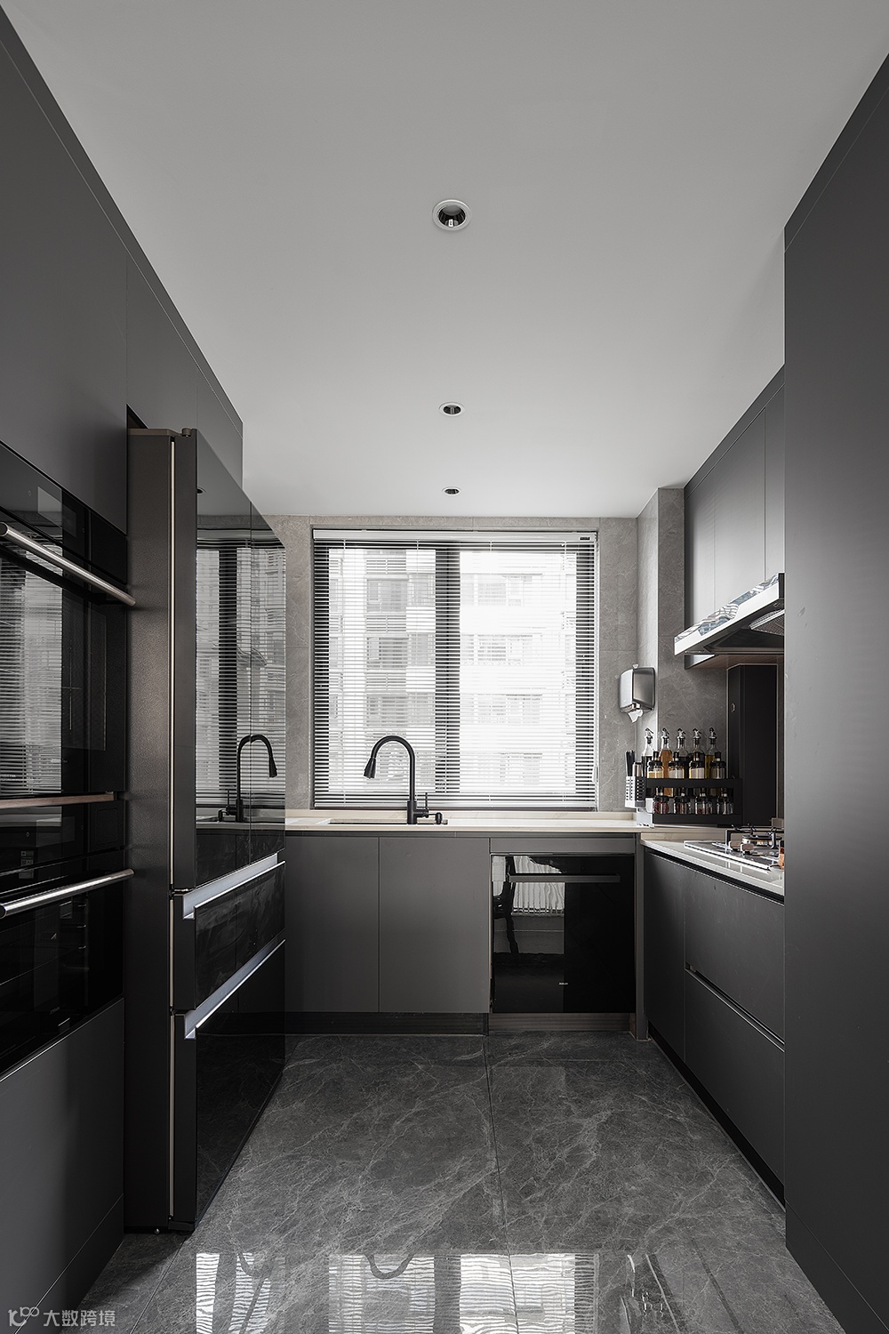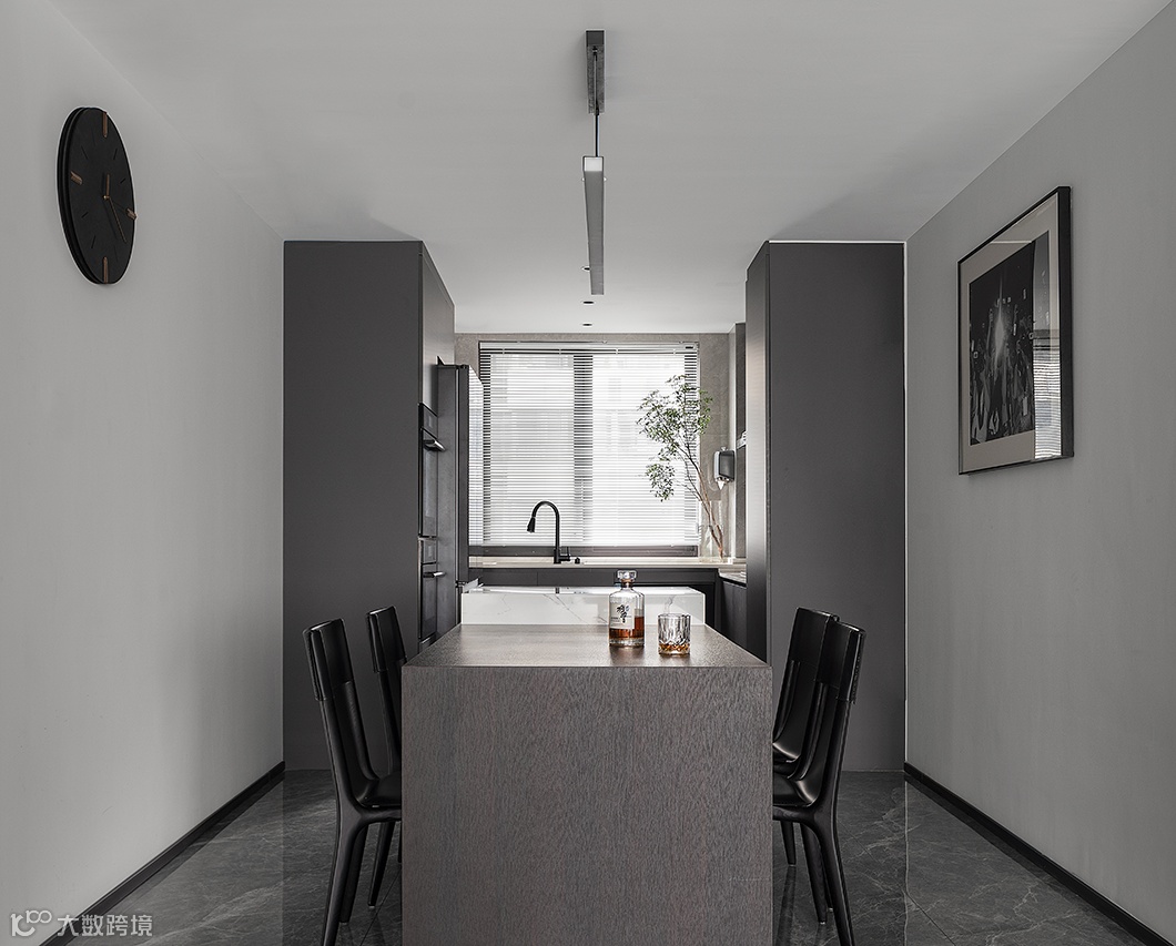 开放式厨房光线通透,空间两侧做收纳柜,表面上看不到多余的物品,实则巧妙的藏在设计当中。